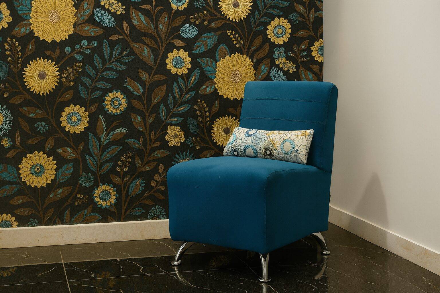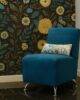 El sillón Karee  tapizado en tela velvet azul marino es ideal para quienes buscan un toque sofisticado sin saturar el espacio.