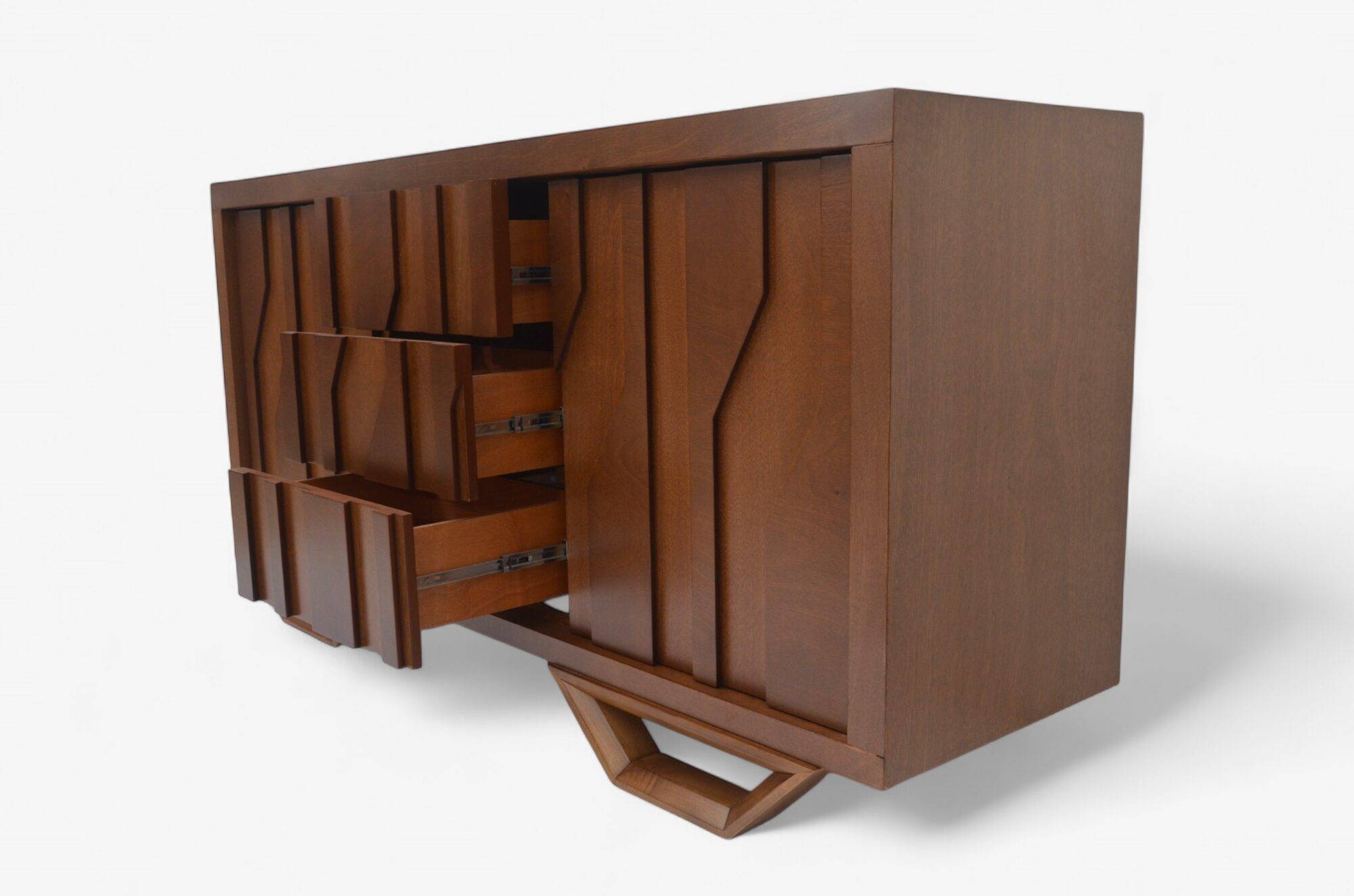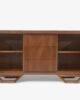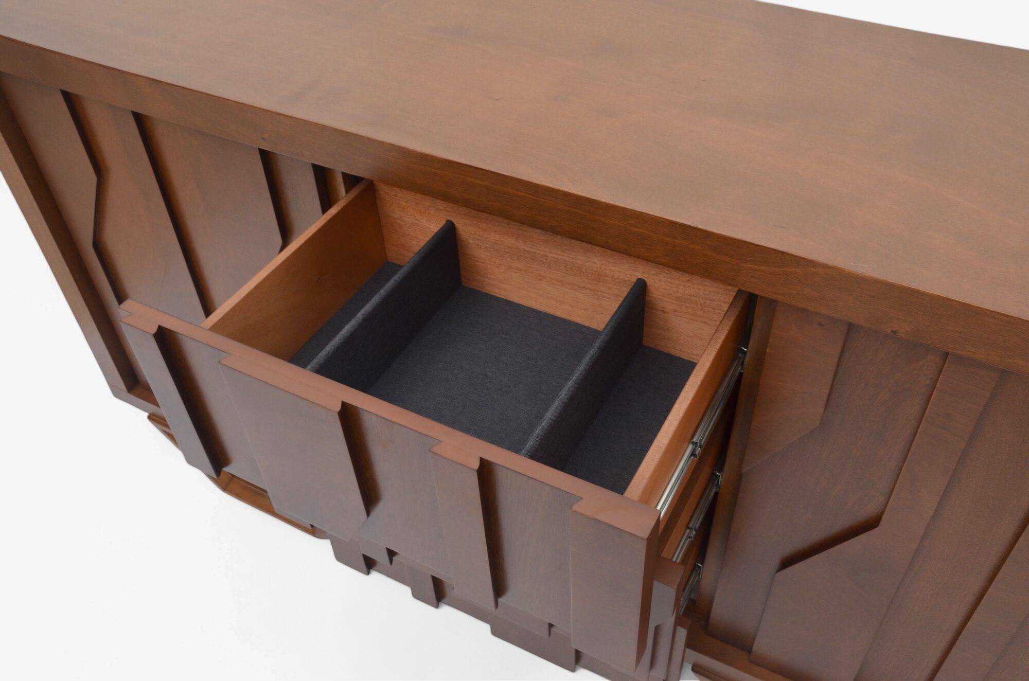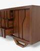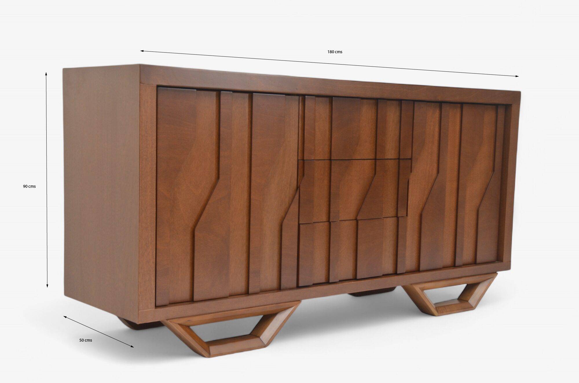 Buffet Moment fabricado en corteza de Okume con un diseño geometrico cuenta con unas dimensiones de 1.80 cm de largo por 50 cm de ancho por 90 cm de alto.