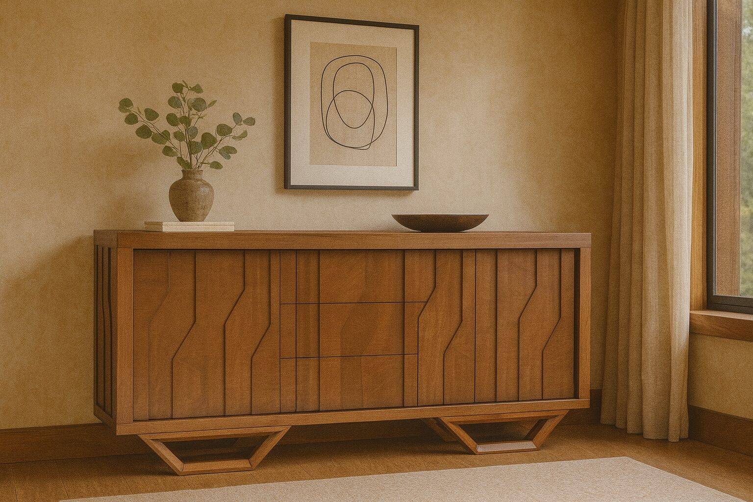 Elegancia, orden y diseño contemporáneo en una sola pieza. Este buffet fabricado en corteza de Okume, con acabado en color tabaco, destaca por sus formas geométricas marcadas y un frente tallado con líneas limpias y modernas que añaden carácter visual. Su estructura de 1.80 m de largo x 0.40 m de fondo lo convierte en una opción versátil para comedores, ofreciendo gran capacidad de almacenamiento sin ocupar espacio excesivo. cuenta con tres cajones centrales se suave deslizamiento y 2 puertas laterales que ocultan entrepaños amplios, ideales para organizar vajillas, mantelería, objetos decorativos o lo que necesites mantener en orden.