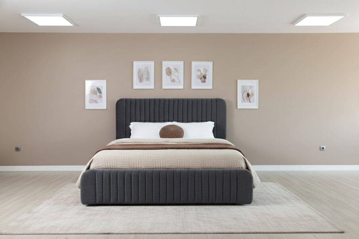 Tapizada en tela Amber Steel, de tono sobrio y textura refinada, esta cama se adapta fácilmente a distintos estilos decorativos, desde minimalista hasta contemporáneo. Su estructura sólida y proporciones amplias brindan una experiencia de descanso cómoda y estable, convirtiéndola en una pieza protagonista del espacio.