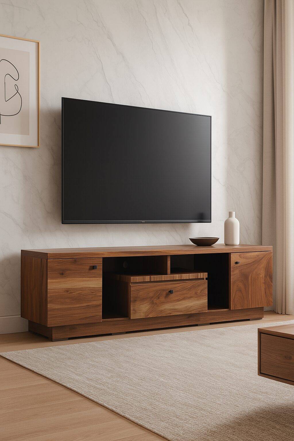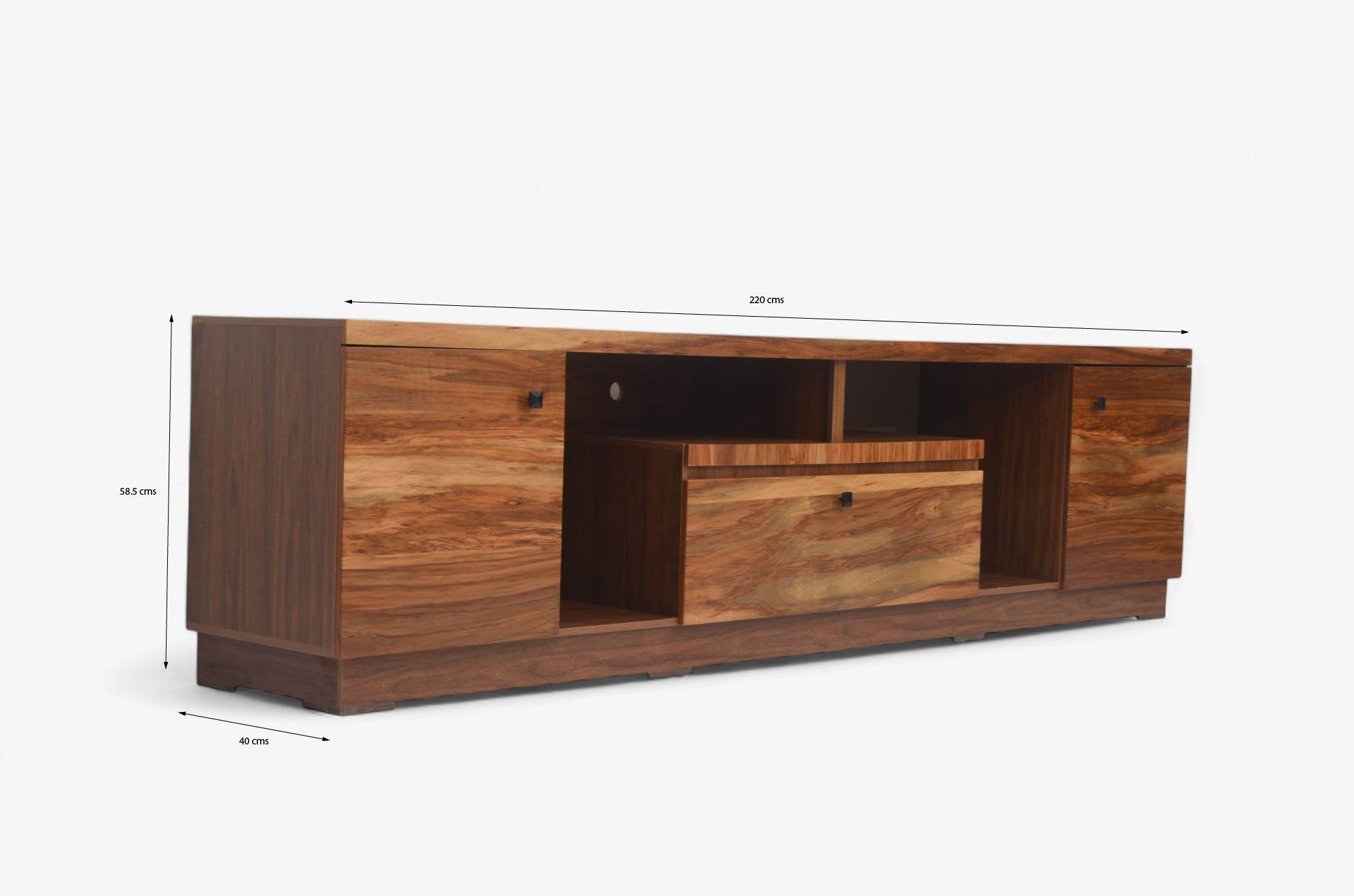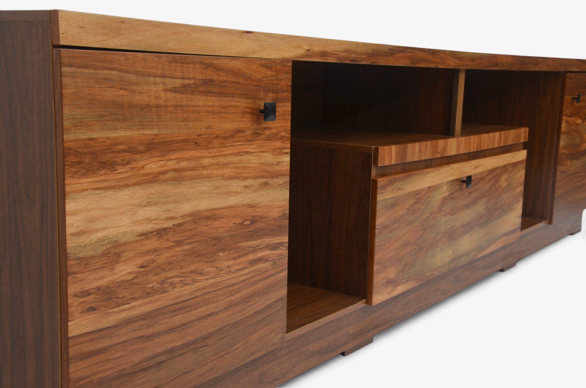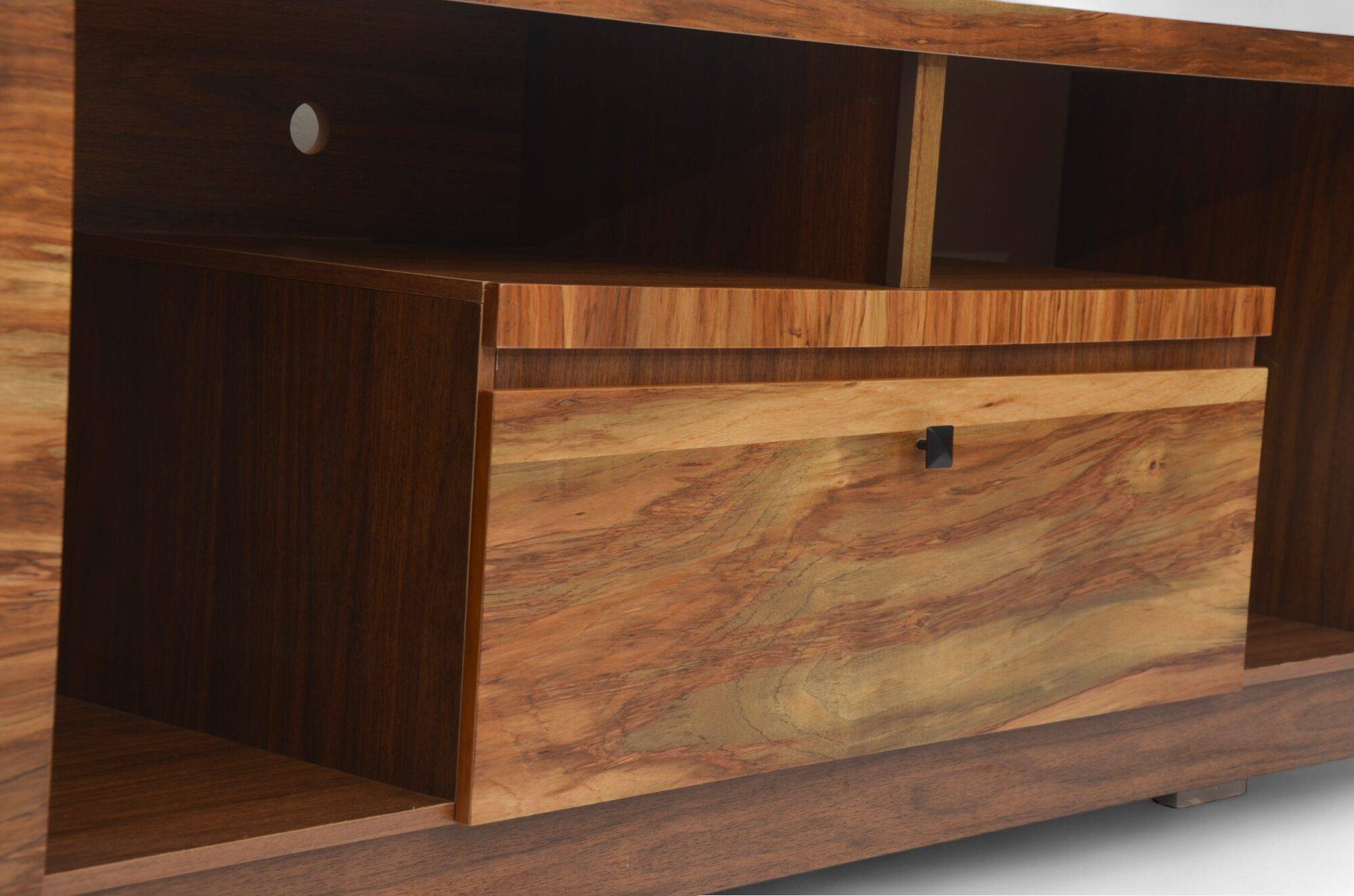 El centro de entretenimiento Berlín fabricado en corteza de Tzalam es una pieza única y elegante que combina la belleza natural de la madera con un diseño funcional y moderna.