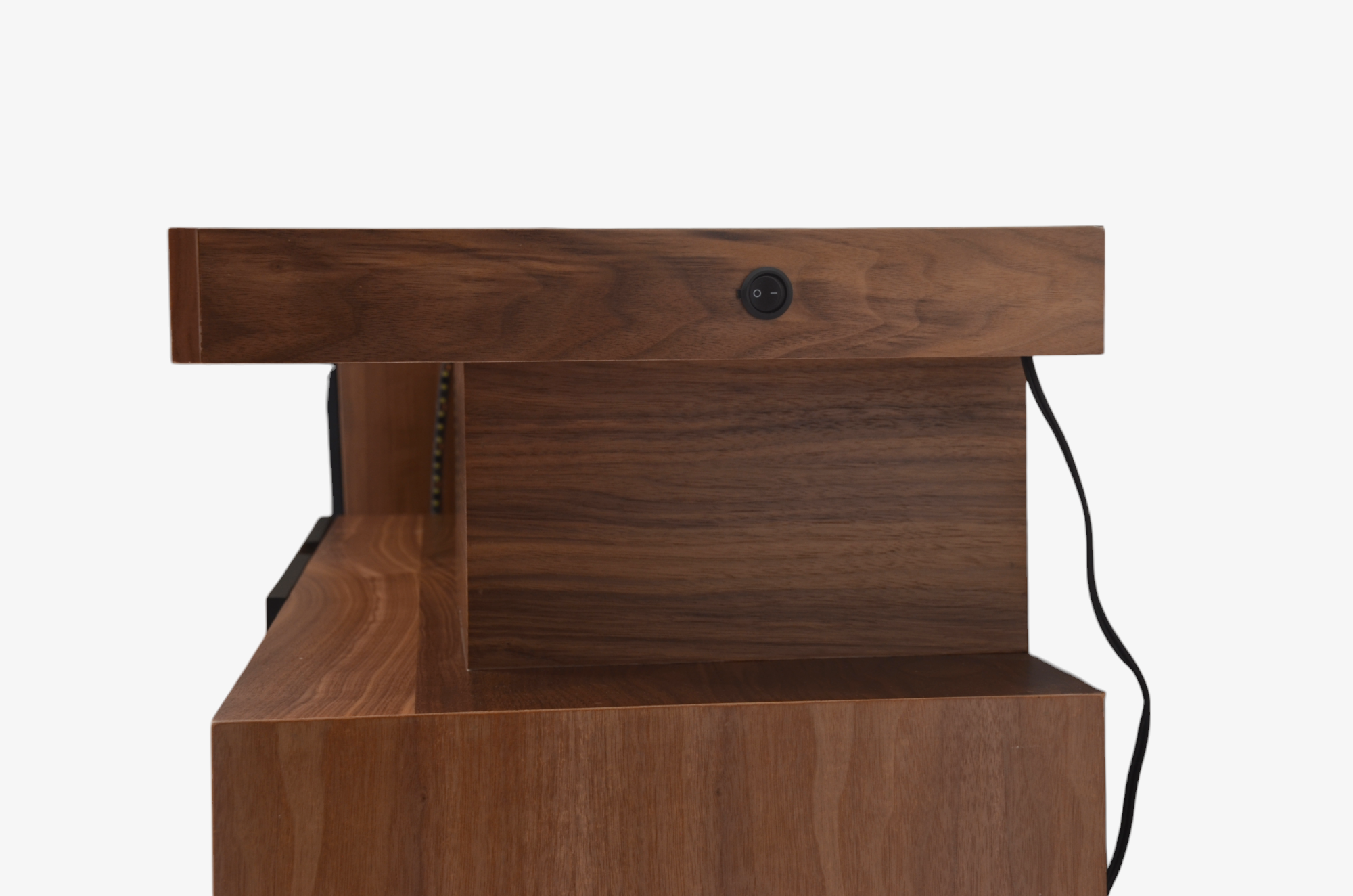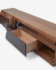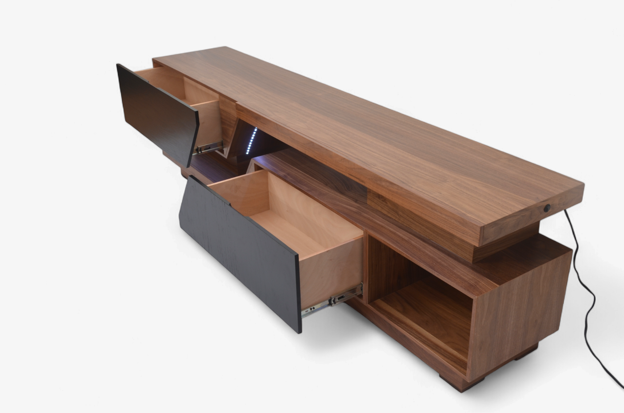 Este centro de entretenimiento representa la fusión perfecta entre diseño contemporáneo y materiales de alto prestigio. Sus cajones incluyen detalles en negro pirita con acento elegante que aporta contraste visual y modernidad, el diseño incorpora además un entrepaño iluminado con luz LED, ideal para destacar objetos decorativos o mantener visibilidad en espacios oscuros, generando un ambiente acogedor y estilizado