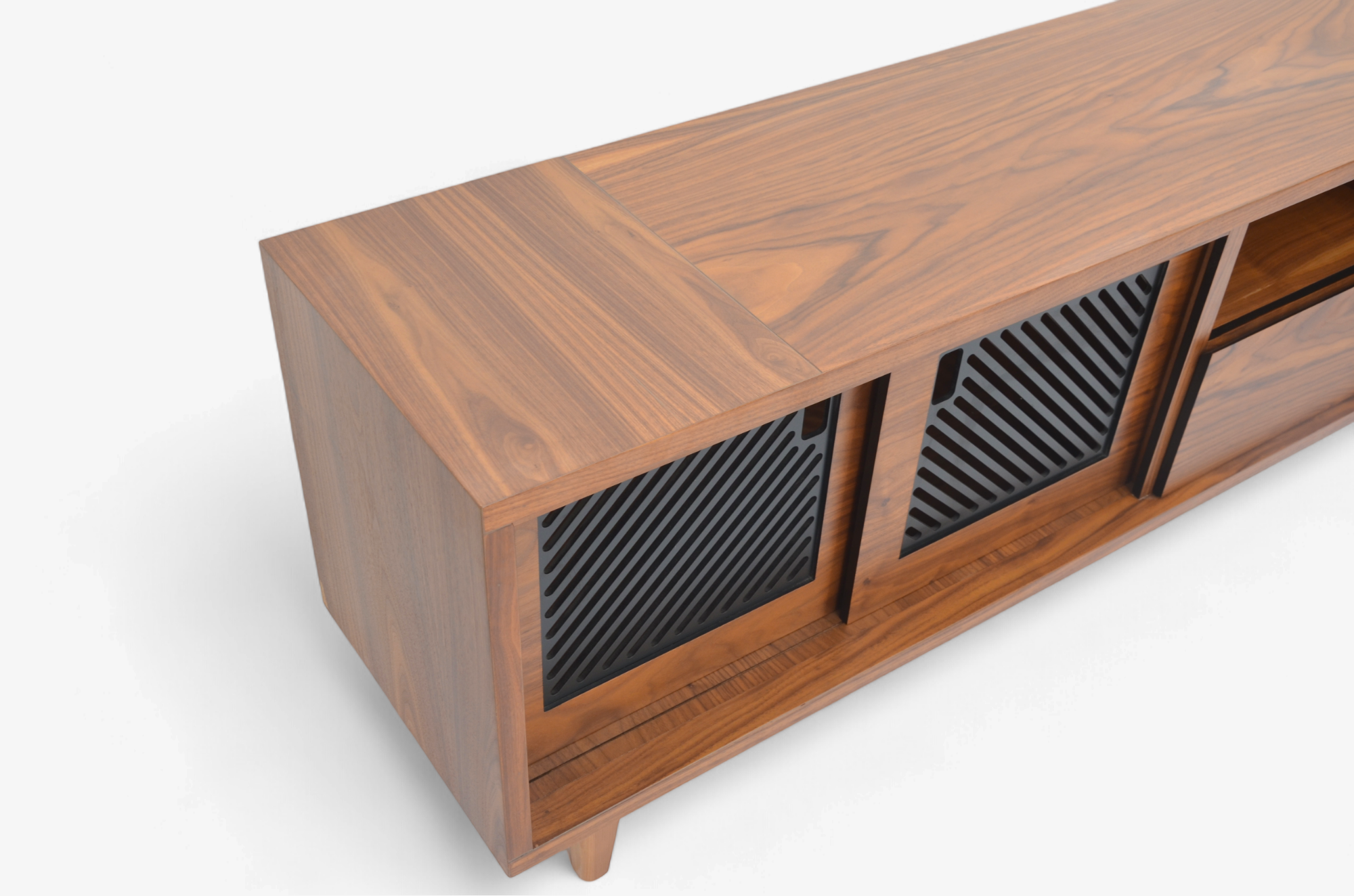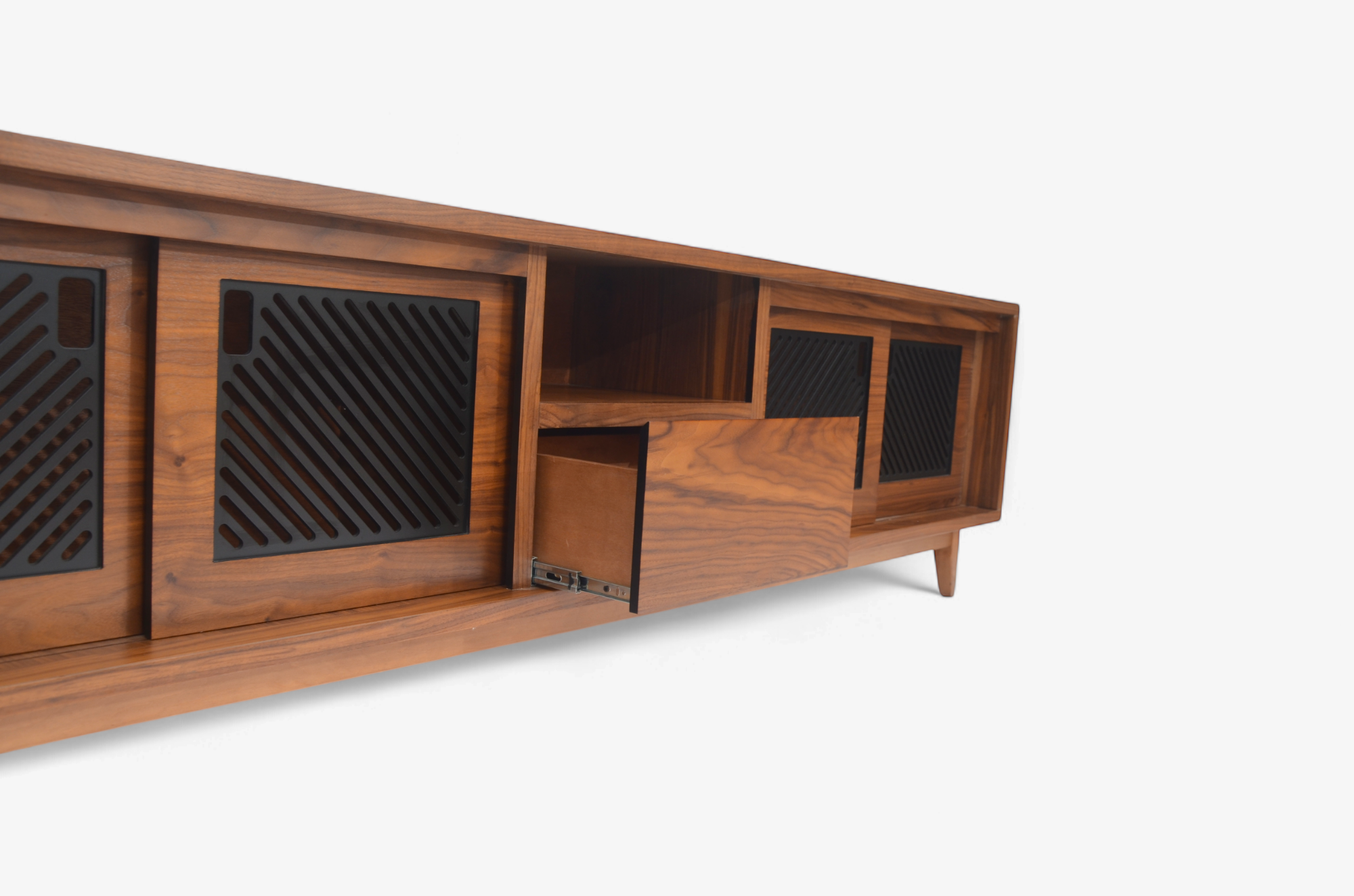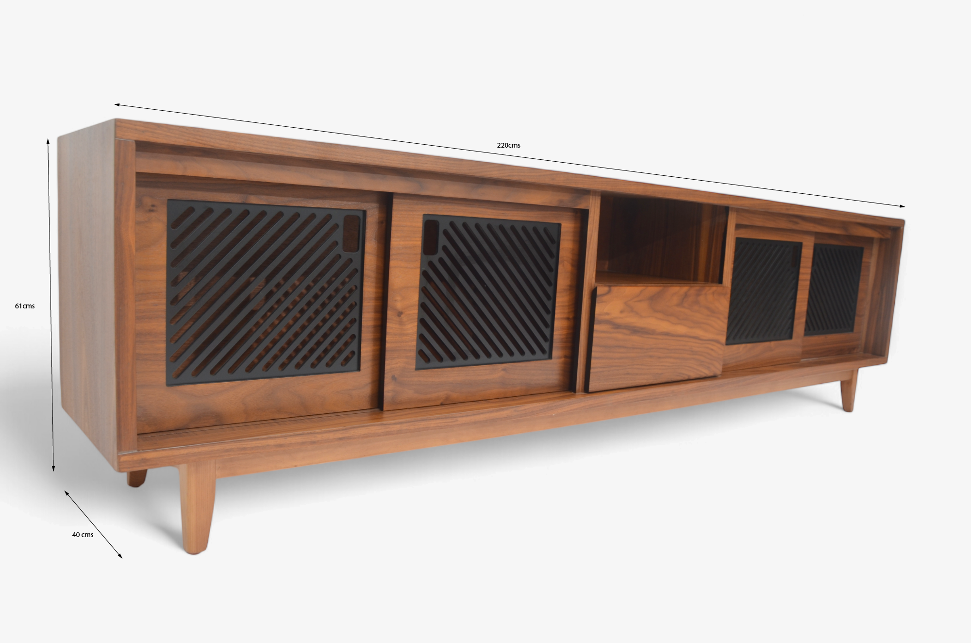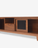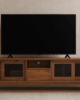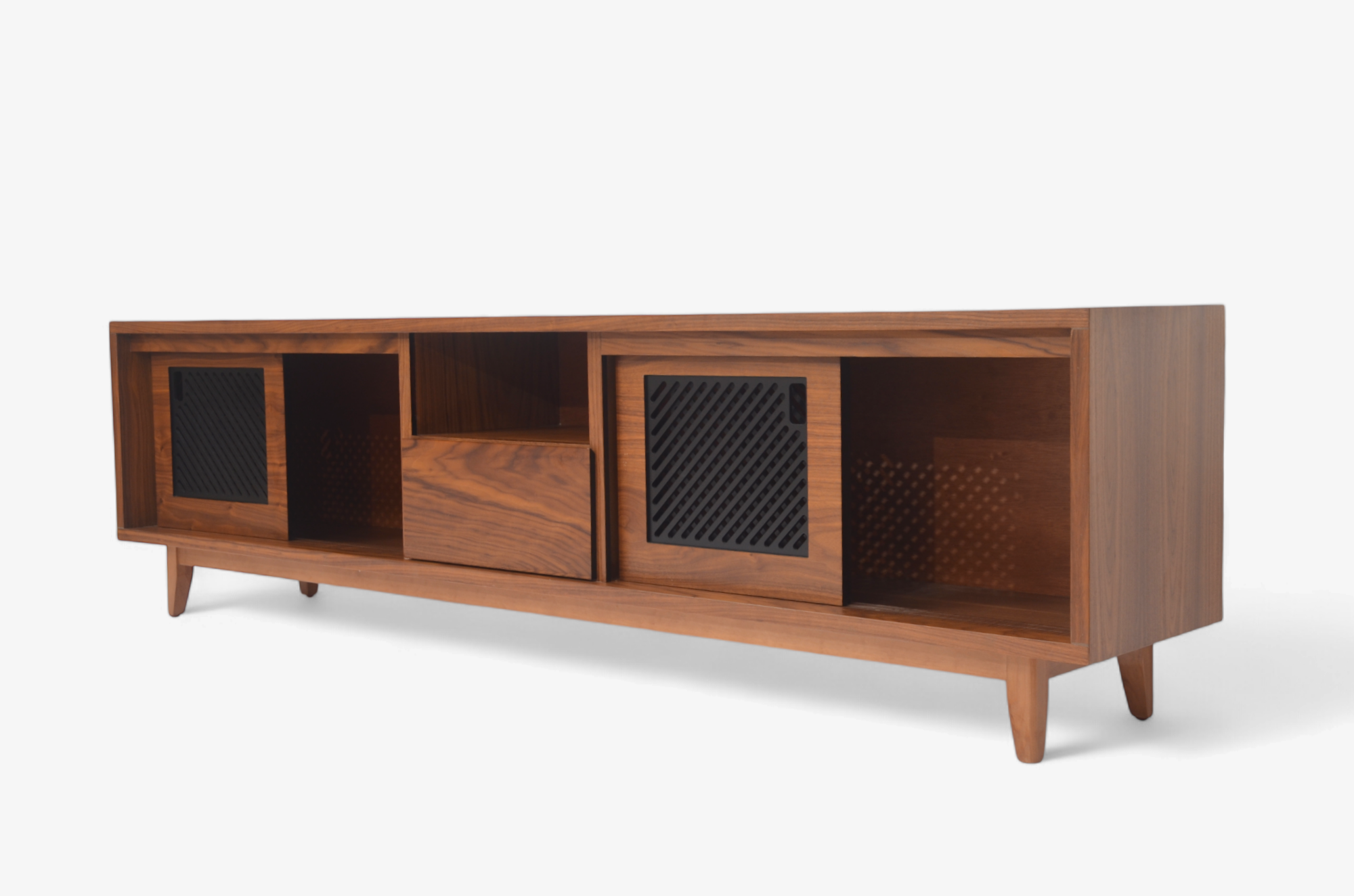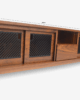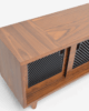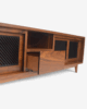 centro de tv modelo oris fabricado en corteza de nogal americano con detalles de celosías en las puertas en color carbón activado