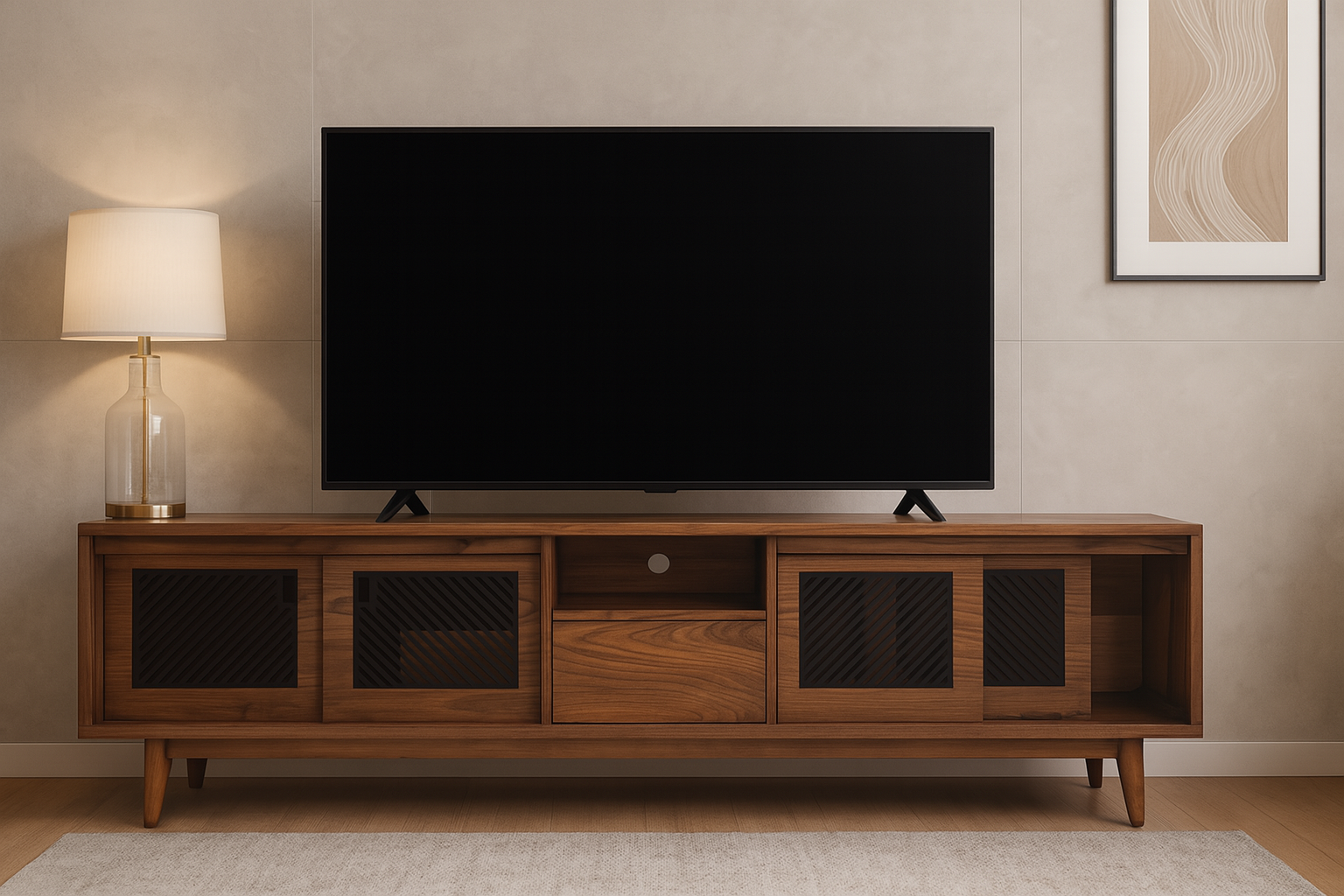 Diseño, textura y funcionalidad se combinan en este centro de tv Oris con puertas decoradas con celosías en tono carbón activado, una propuesta ideal para espacios que buscan carácter y personalidad. Las celosías finamente trabajadas, no solo aportan ventilación natural para dispositivos electrónicos, si no que suman profundidad visual y un toque distintivo al diseño general.
