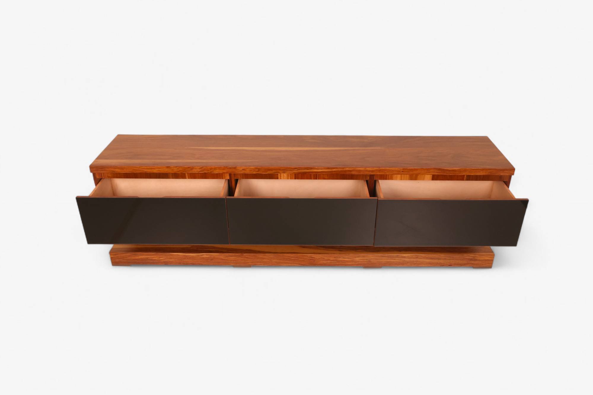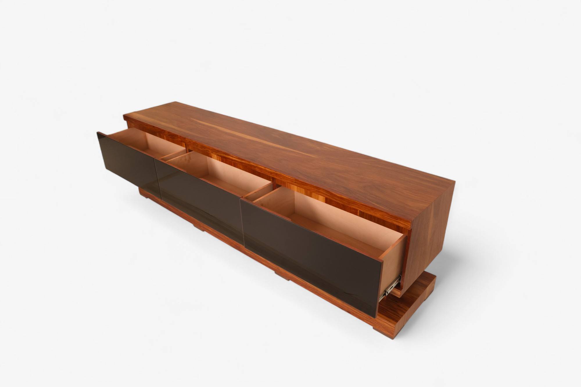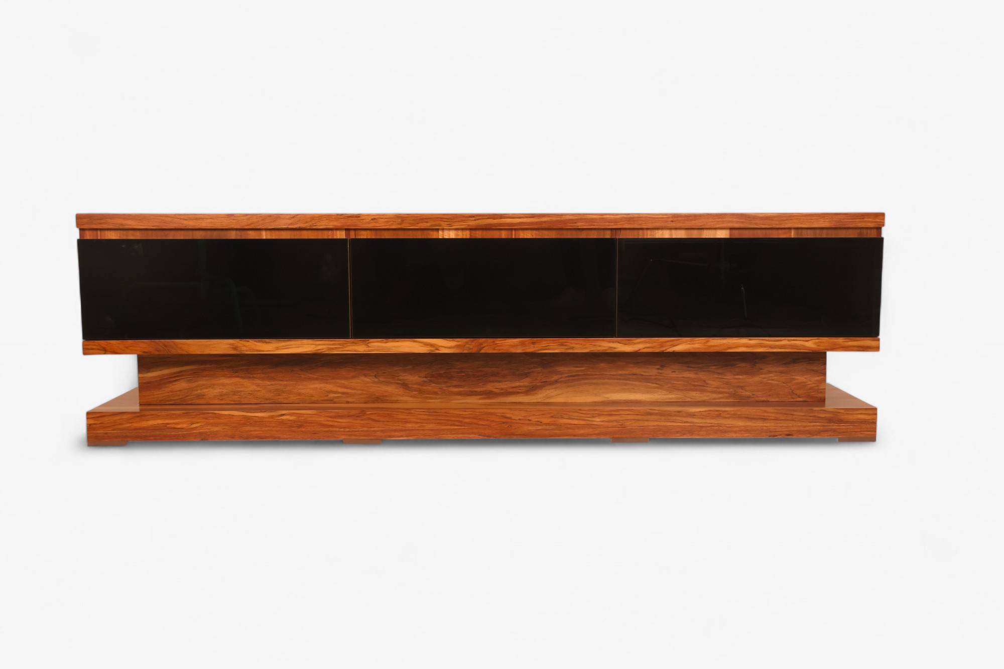 Centro de TV fabricado en madera de tzalam con frentes de cajón en cristal negro obsidiana. Diseño artesanal y contemporáneo con gran capacidad de almacenamiento. Elegancia y funcionalidad para tu sala.