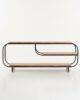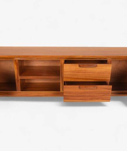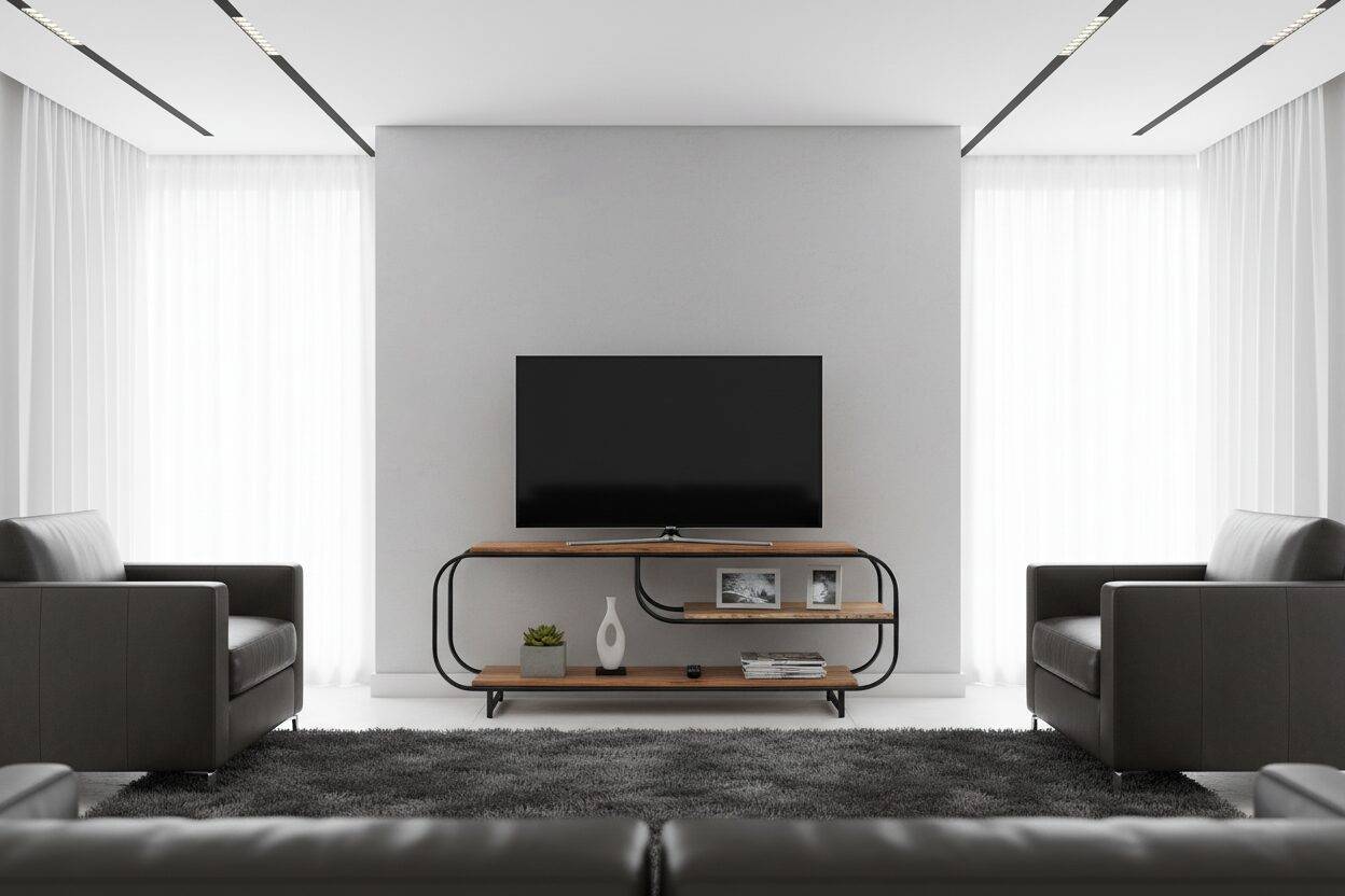Su diseño amplio permite colocar televisores grandes, dispositivos electrónicos y objetos decorativos, manteniendo siempre una apariencia ordenada y moderna.