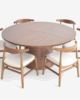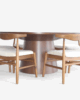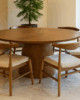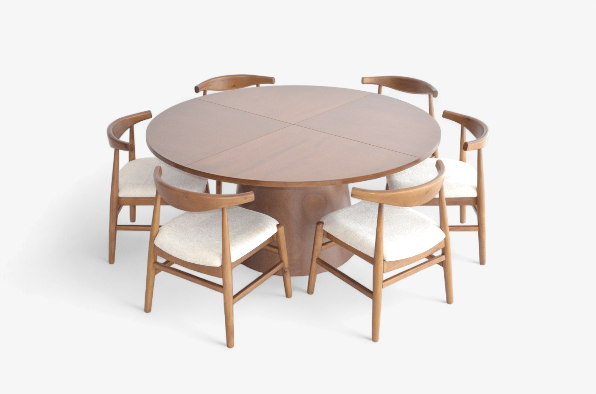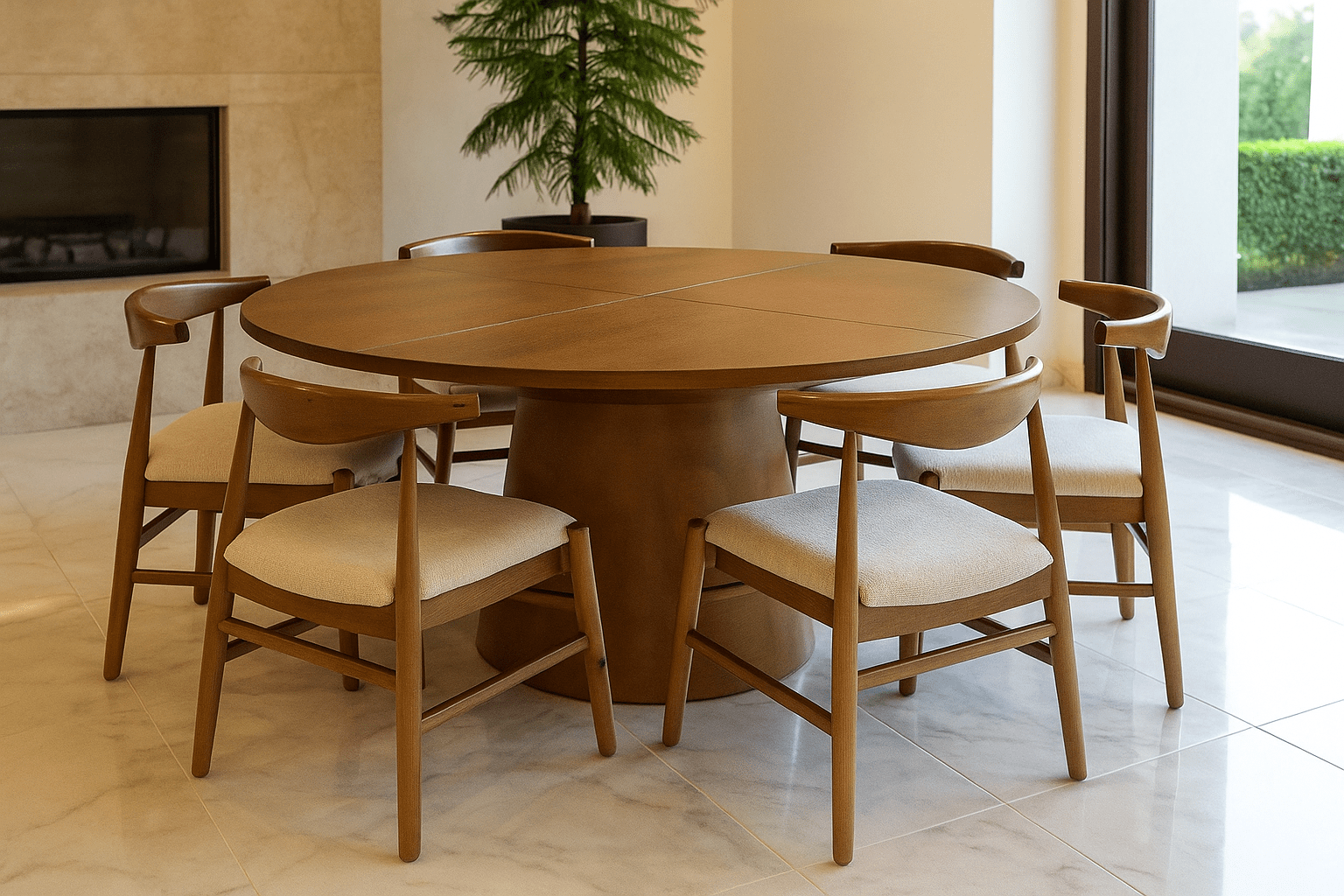 Comedor circular Bosse para 6 personas, con cubierta redonda de 1.60 m en corteza Okumé Tabaco. Incluye 6 sillas de madera Poplar Americano con tela farrel ivory. Diseño elegante y funcional.