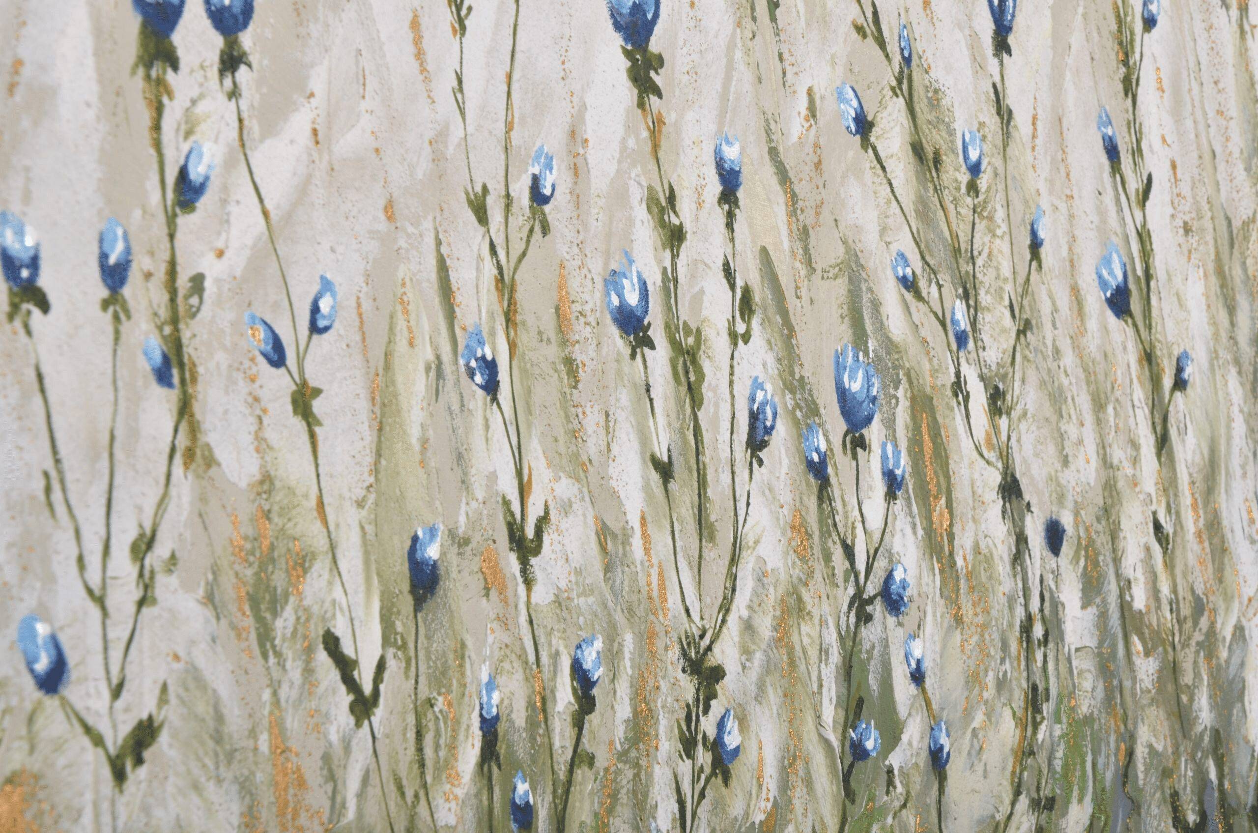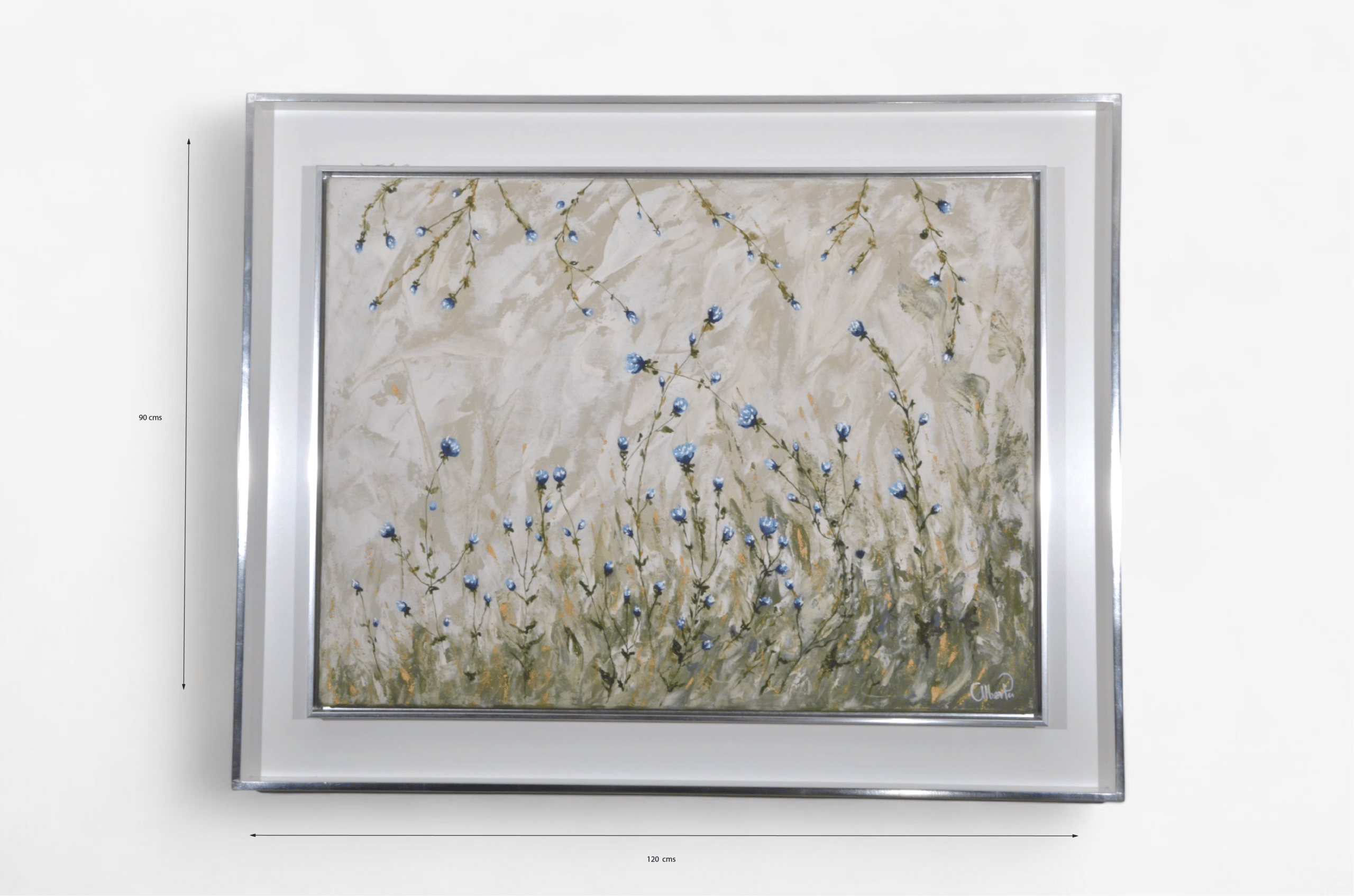 El cuadro Altruismo y Sacrificio (120 x 90 cm) captura la esencia de la entrega incondicional a través de una composición delicada y armoniosa. Pintado en técnica mixta al óleo, presenta una escena natural donde flores azules se alzan sobre un fondo neutro, evocando serenidad, belleza y crecimiento.