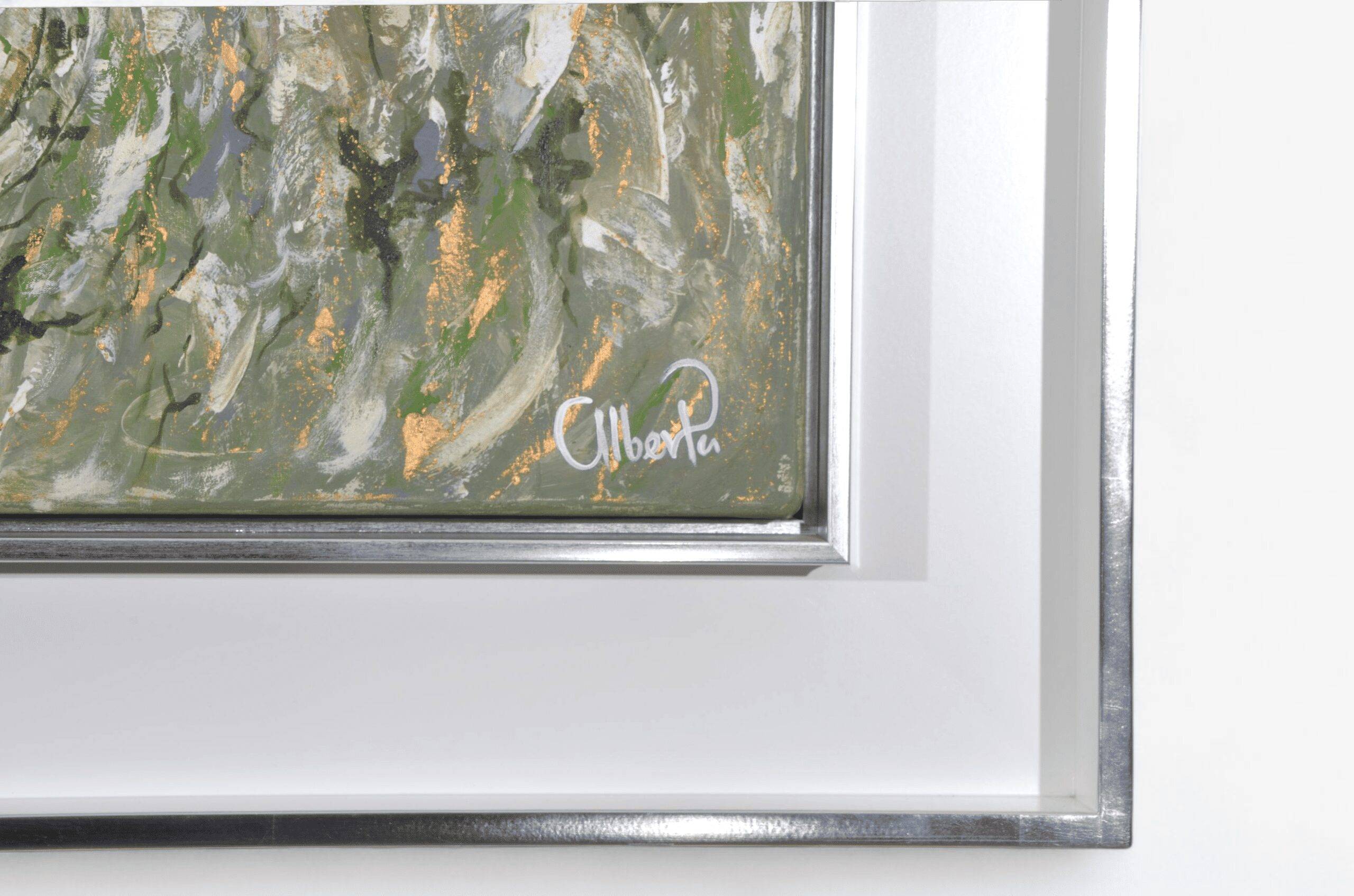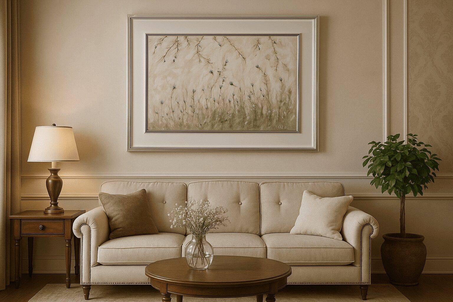 Con pinceladas expresivas y un juego de tonos suaves, esta pieza transmite calma y profundidad emocional, ideal para interiores que buscan un mensaje sutil y significativo. El marco en acabado metálico y fondo blanco resalta cada trazo sin restar protagonismo, haciendo de esta obra un punto focal elegante en salas, estudios o espacios contemplativos.