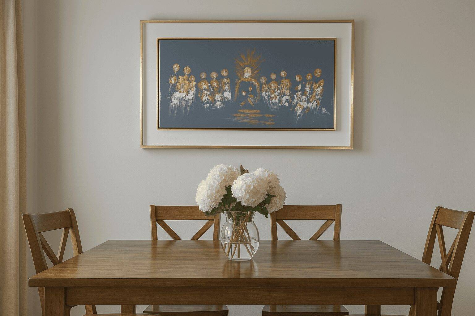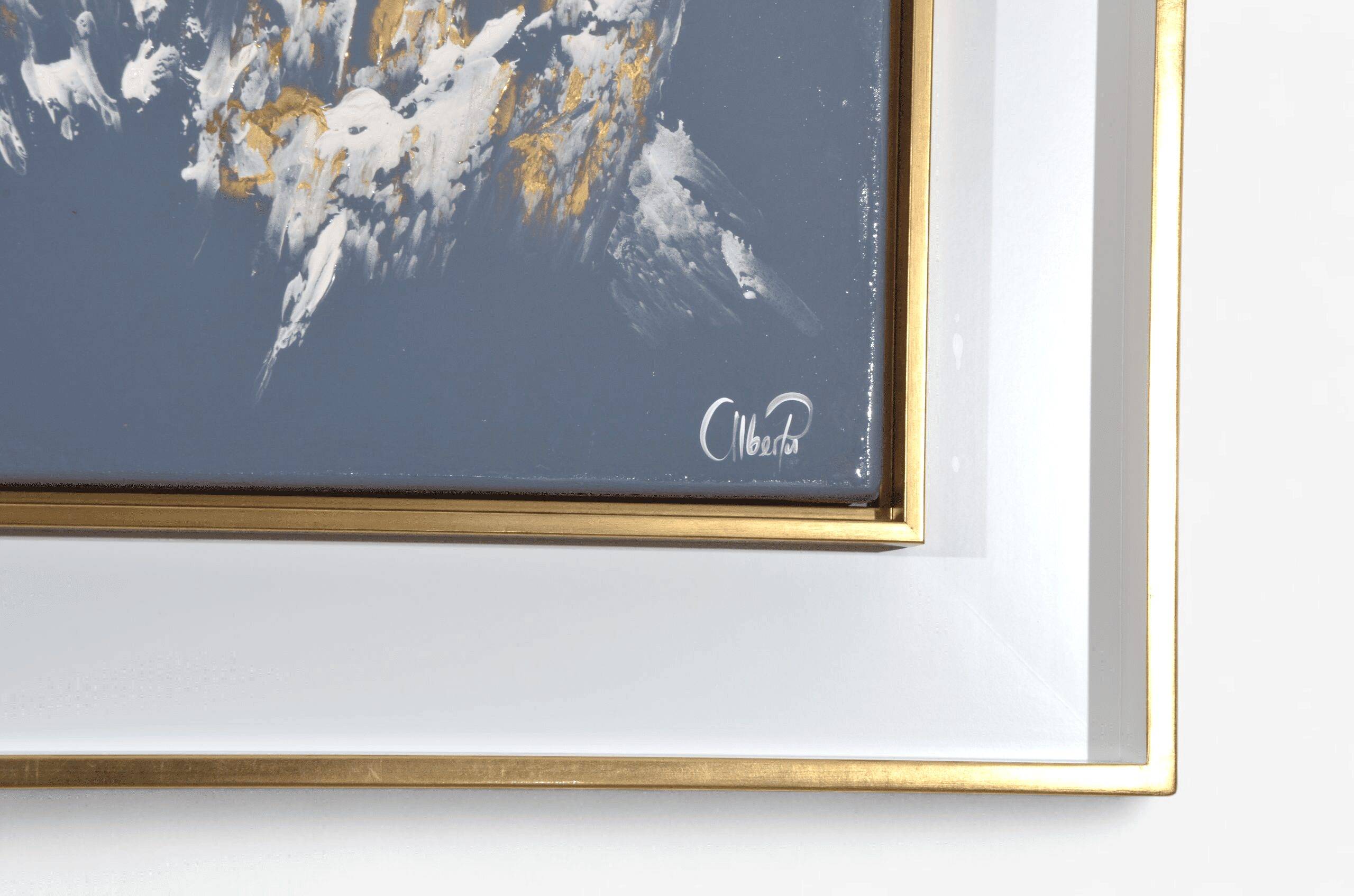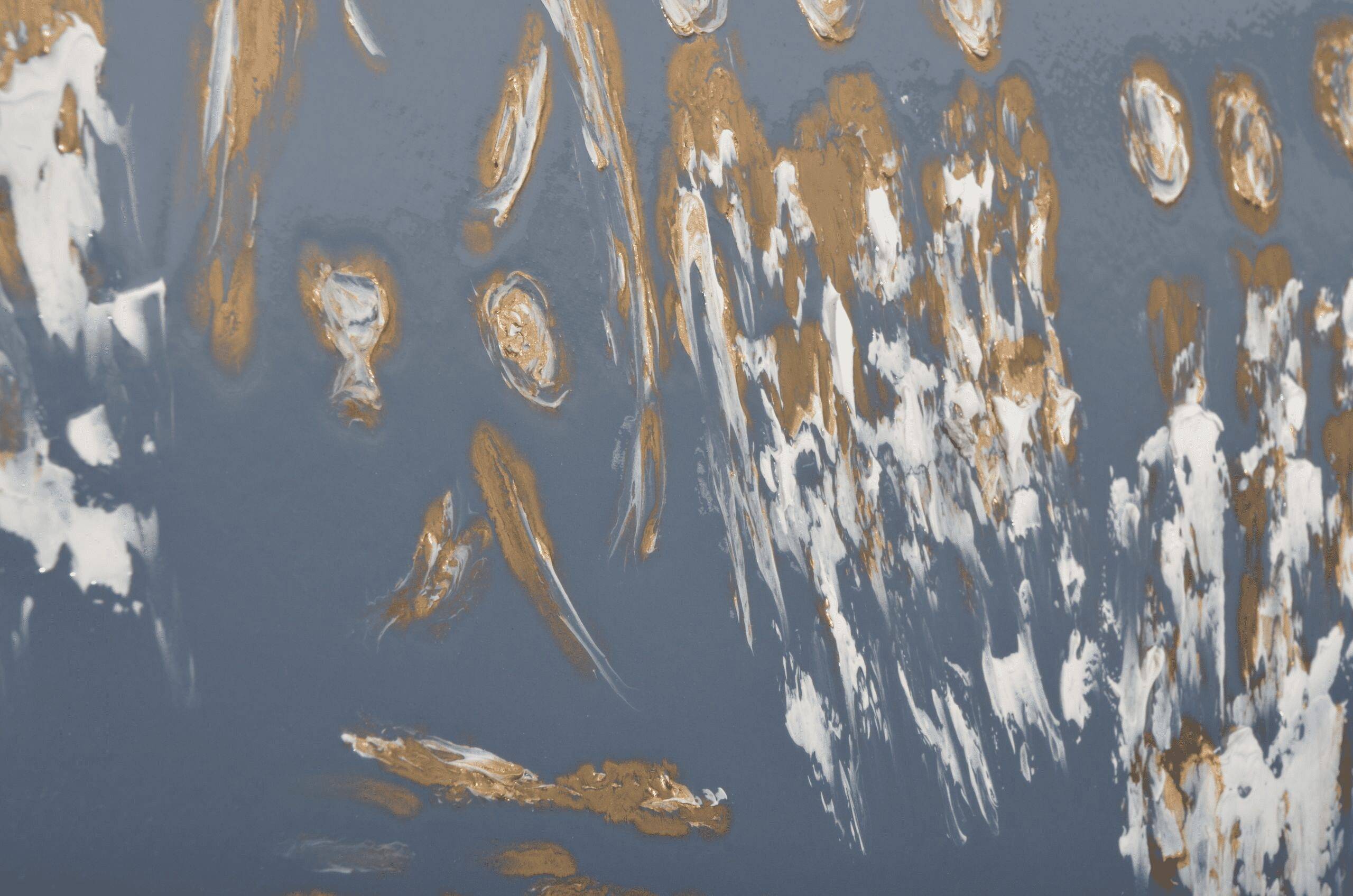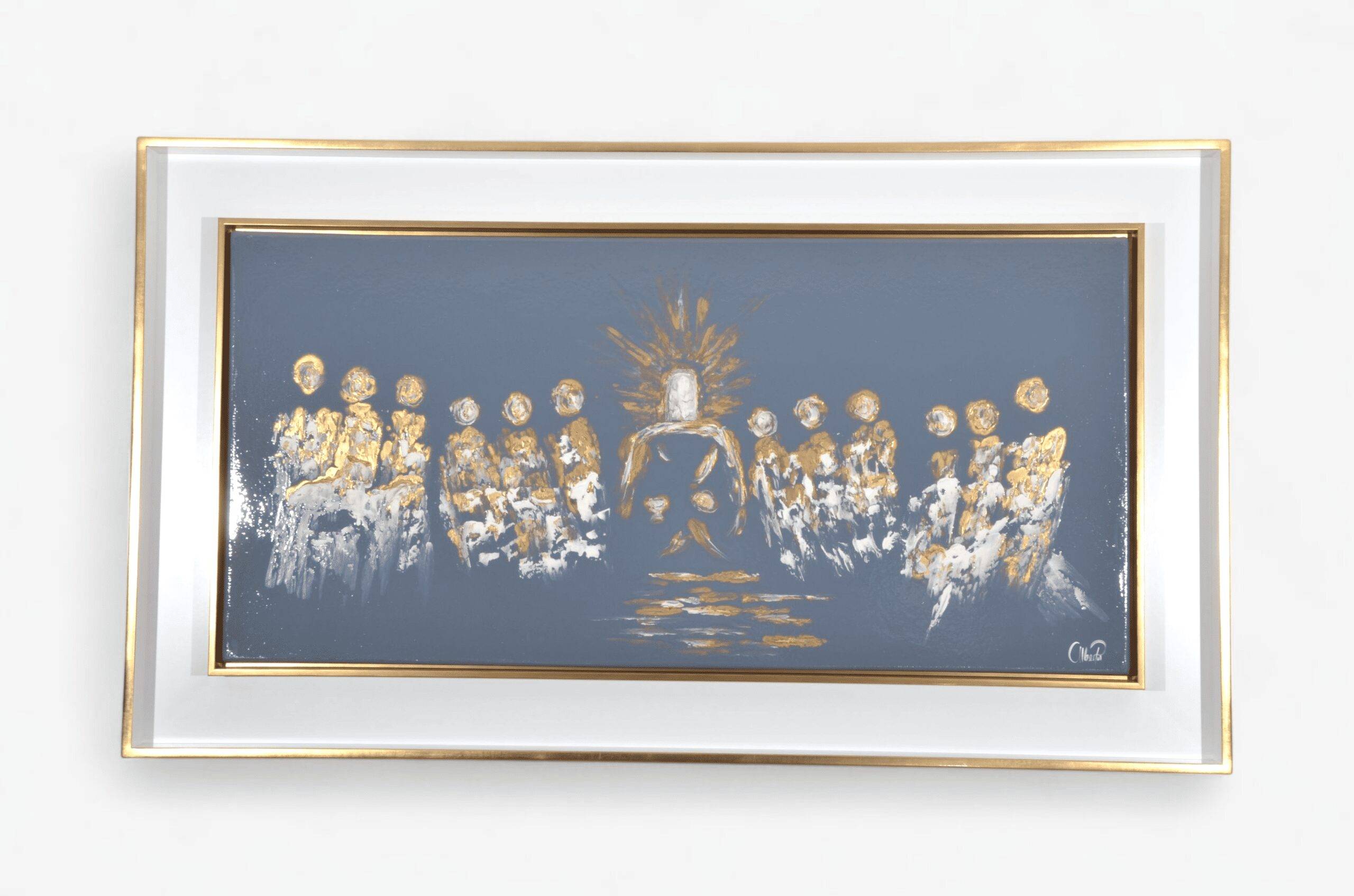 El cuadro “La compañía” es una pieza expresiva de la colección Esperanza, trabajada en óleo con técnica mixta sobre lienzo. Su composición equilibra tonos dorados y blancos sobre un fondo gris profundo, evocando un fuerte sentido de comunidad, unión y propósito compartido. El acabado brillante, combinado con detalles abstractos, le confiere una presencia visual destacada, ideal para enriquecer salas, recibidores o espacios contemplativos.