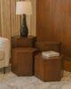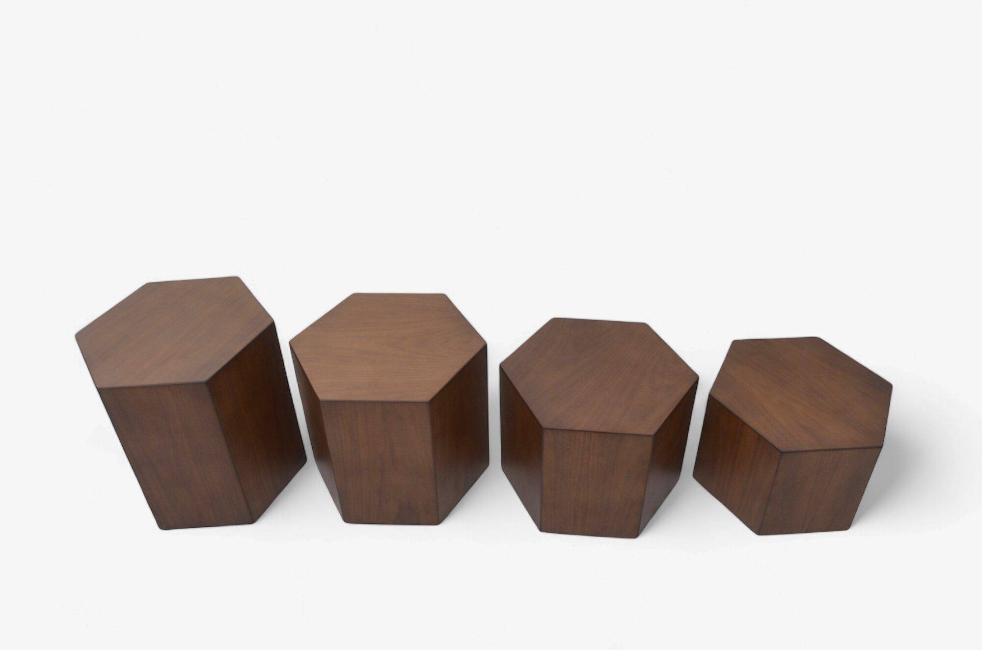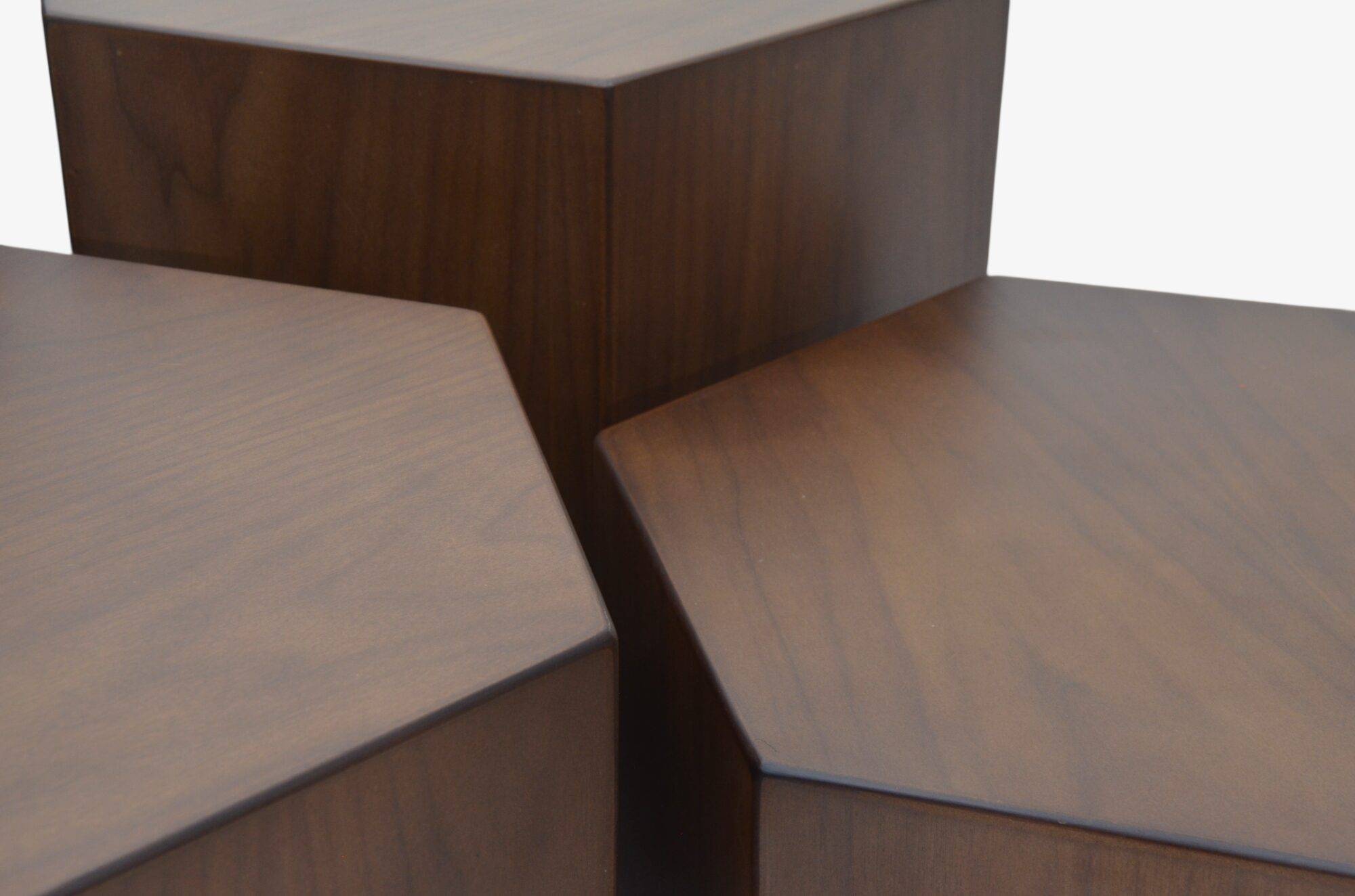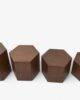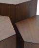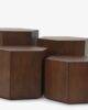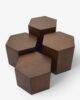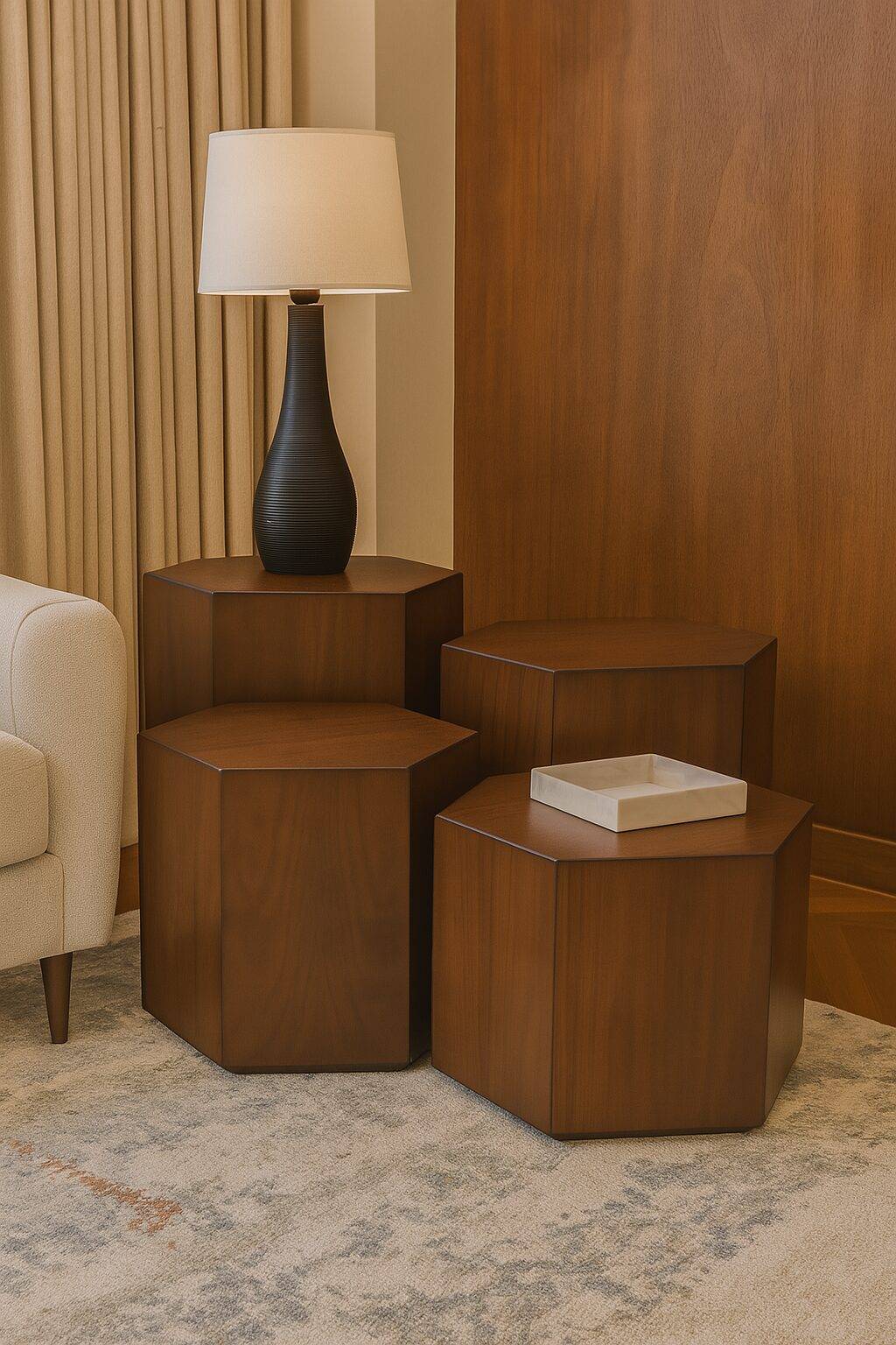 Diseño geométrico con elegancia atemporal. Este elegante juego de mesas de centro está compuesto por 4 piezas en forma hexagonal, que combinan diseño contemporáneo con calidez natural. Incluye 2 mesas grandes y 2 mesas más chicas, todas fabricadas en fina madera de nogal oscuro, un material que aporta sofisticación y profundidad visual a cualquier espacio.