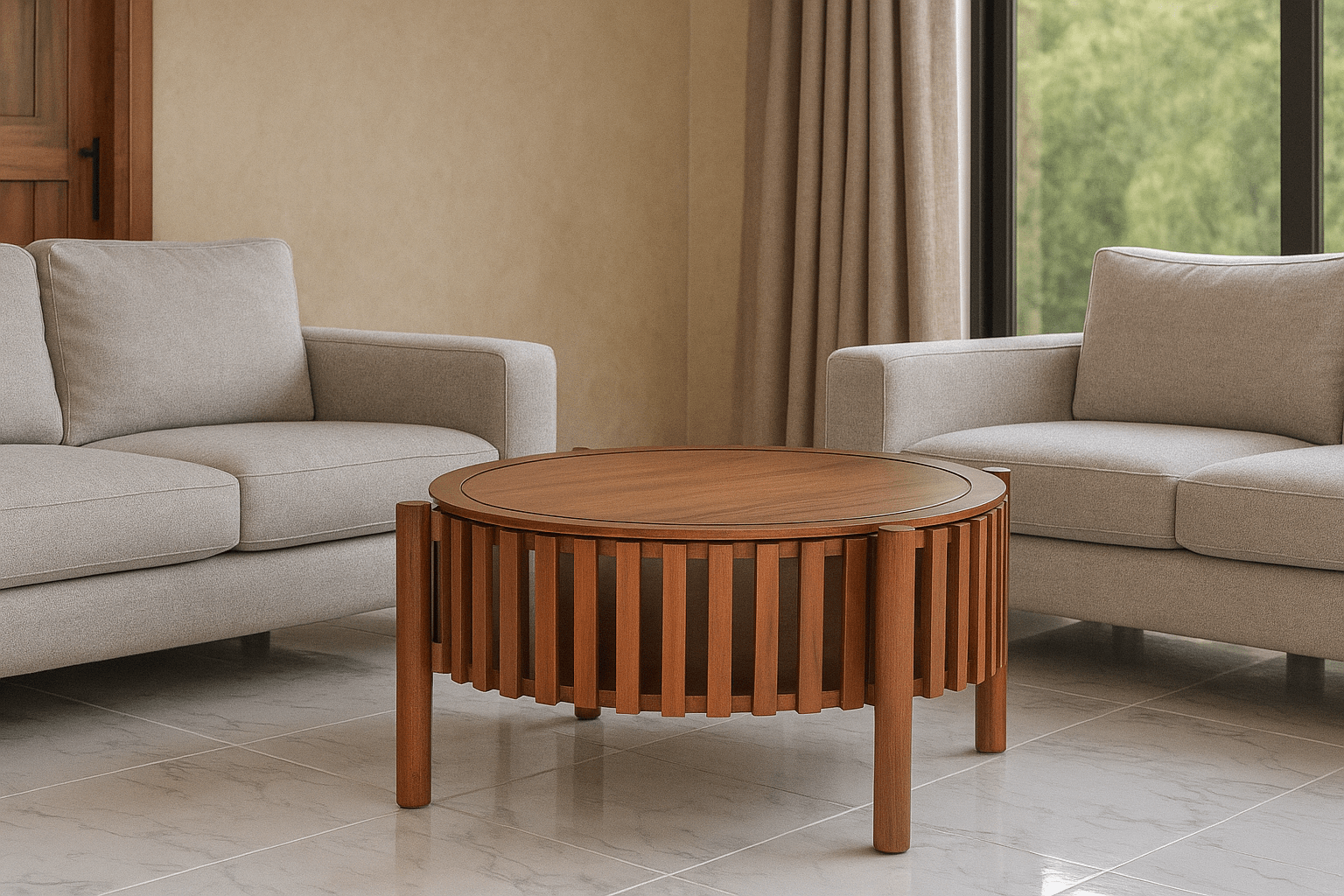 La Mesa de Centro Beneton es el equilibrio perfecto entre diseño moderno y funcionalidad inteligente. Con una forma redonda de 80 cm de diámetro, esta mesa es elaborada en corteza natural de parota, aportando calidez, durabilidad y un estilo contemporáneo a tu sala.