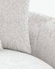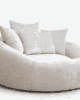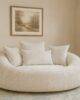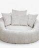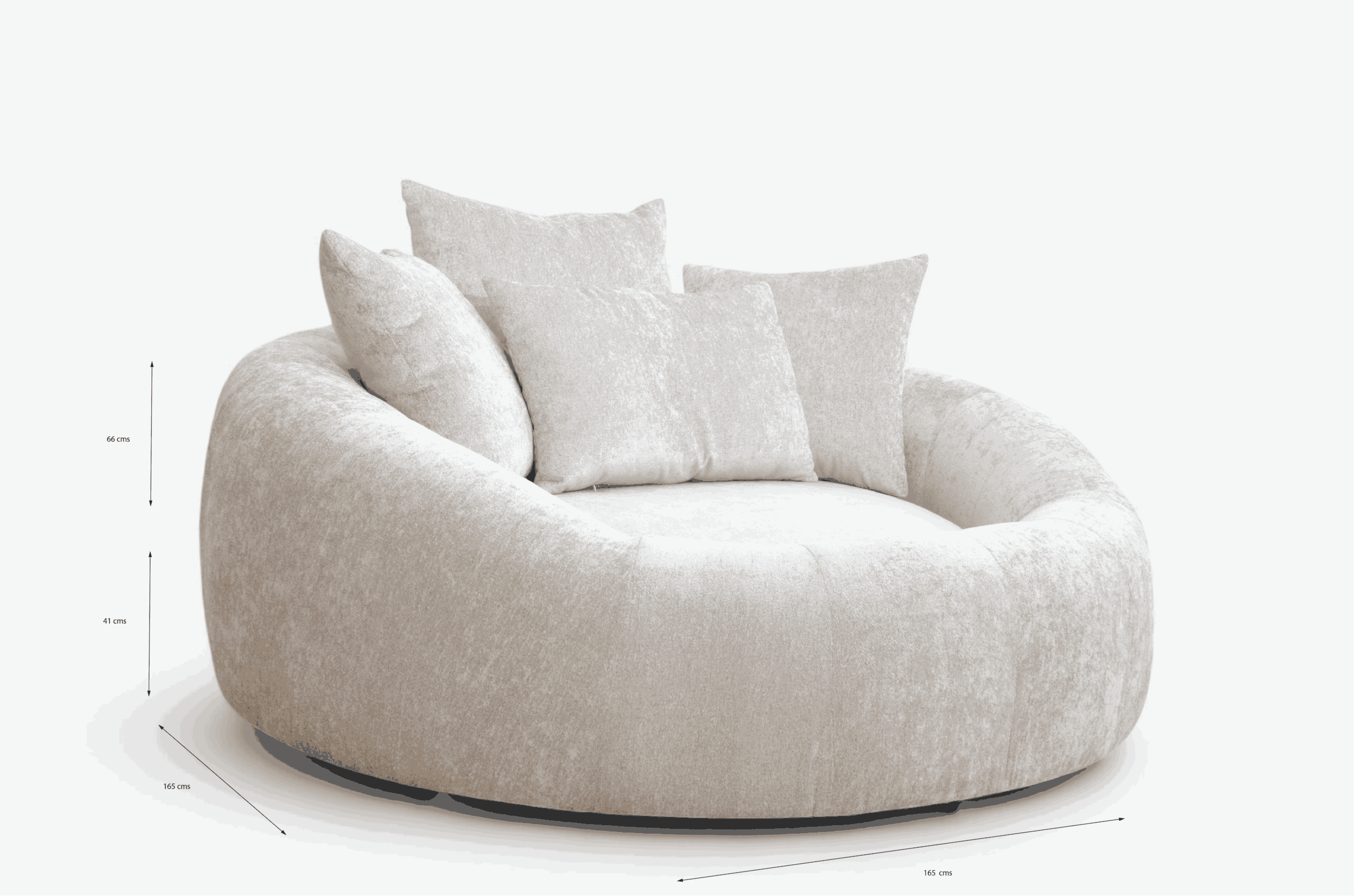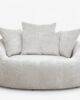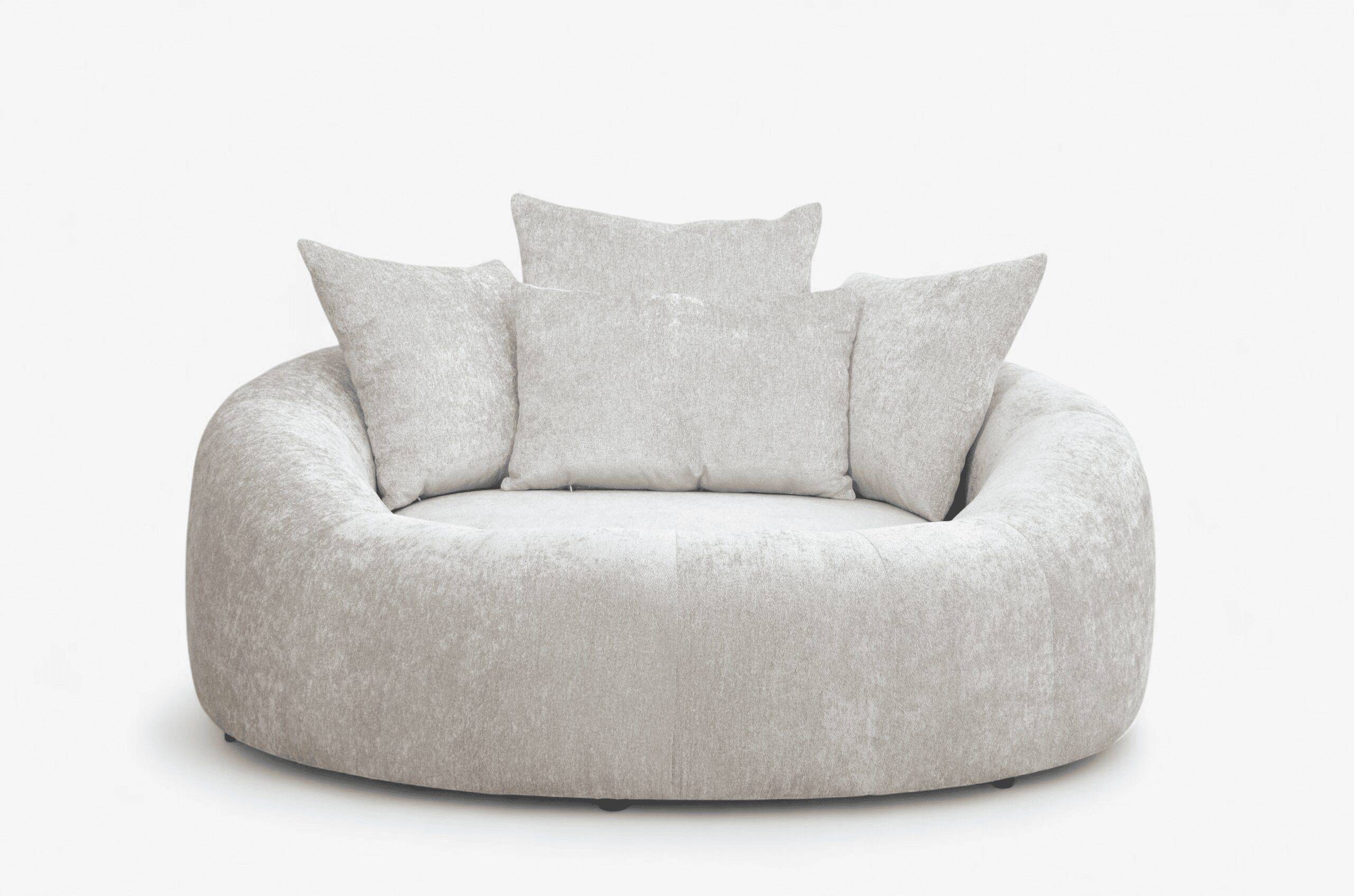 Sofá redondo tapizado en tela Aura Pol plata, con diseño curvo envolvente, ultra cómodo e ideal para destacar en espacios modernos. Incluye 4 cojines grandes para máximo confort.