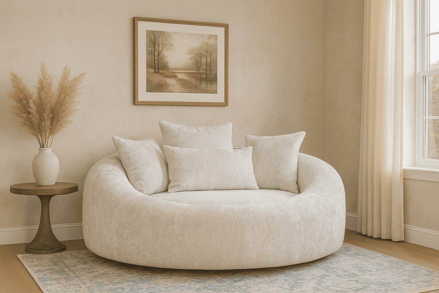 Su diseño curvo genera una sensación acogedora perfecta para relajarte, leer o disfrutar momentos con tus seres queridos. La forma redonda con respaldo envolvente lo convierte en una pieza ideal para destacar en cualquier espacio.