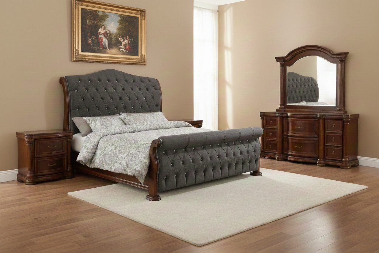 Estética y Acabados: La Recámara Berlín es ideal para quienes buscan un estilo señorial y acogedor. La combinación de la madera oscura con el textil gris profundo permite crear ambientes de alto contraste, funcionando a la perfección con paredes en tonos crema o neutros para resaltar su imponente diseño.