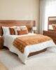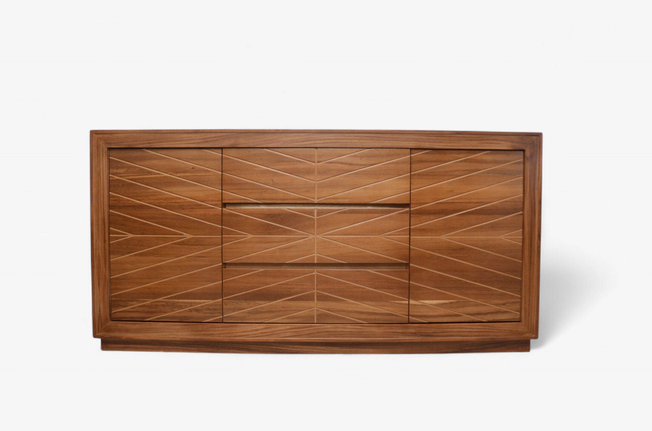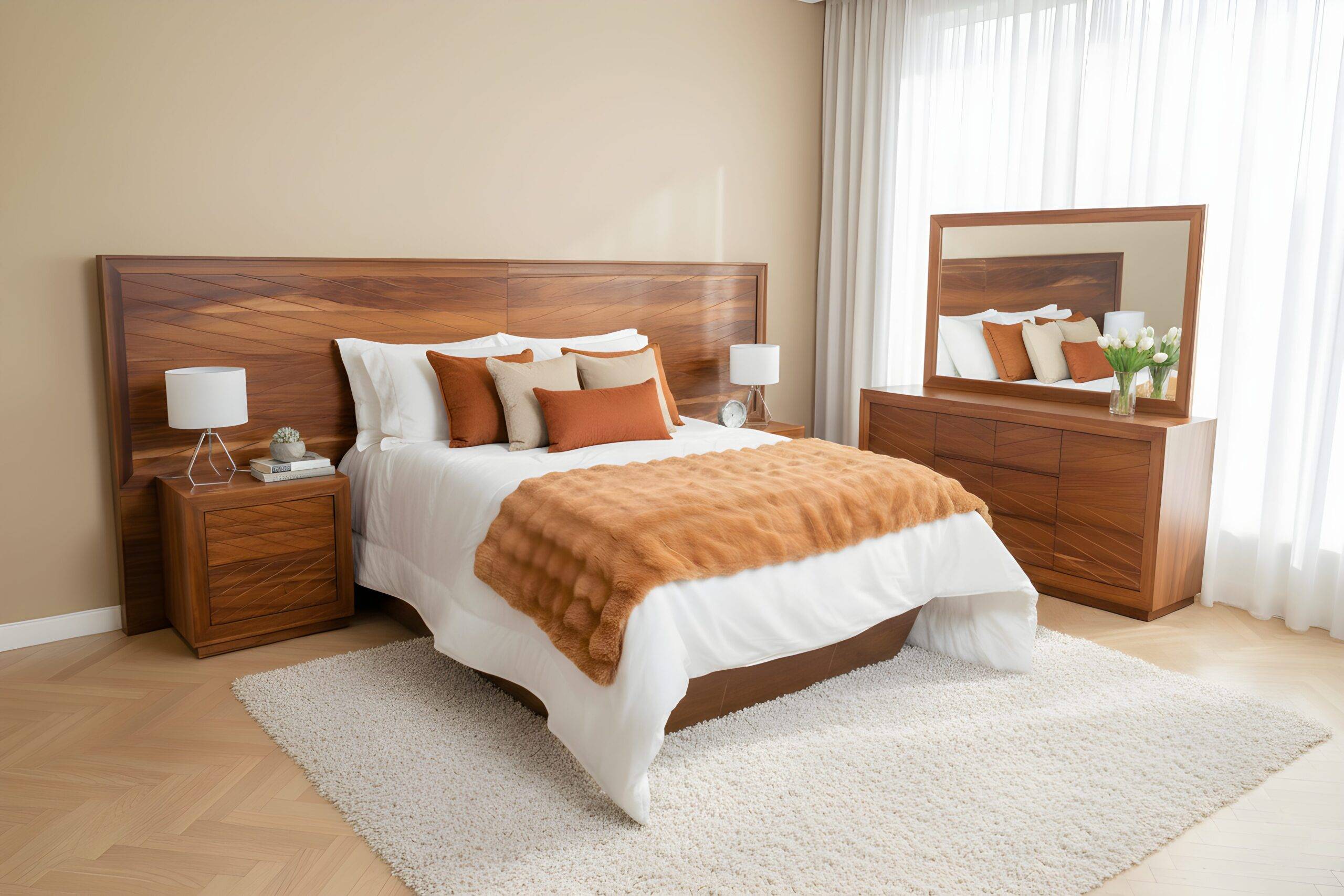 La Recámara Inglaterra es una pieza que roba miradas desde el primer instante. Su cabecera de 3.30 metros de ancho, elaborada en madera sólida de parota, destaca por su imponente presencia y la belleza de sus vetas únicas. Este diseño transmite un aire de sofisticación y calidez, convirtiéndose en el elemento central de cualquier dormitorio.