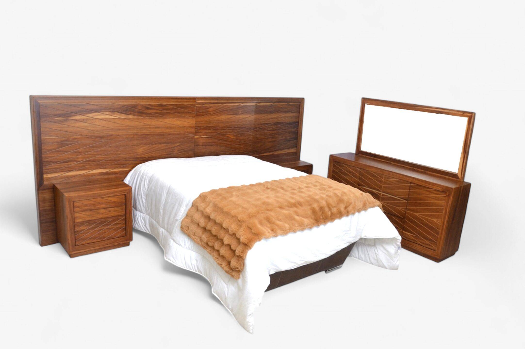 Recámara Inglaterra en parota con cabecera de 3.30 m de ancho. Incluye burós, tocador y espejo. Elegancia y presencia en un diseño único.