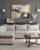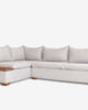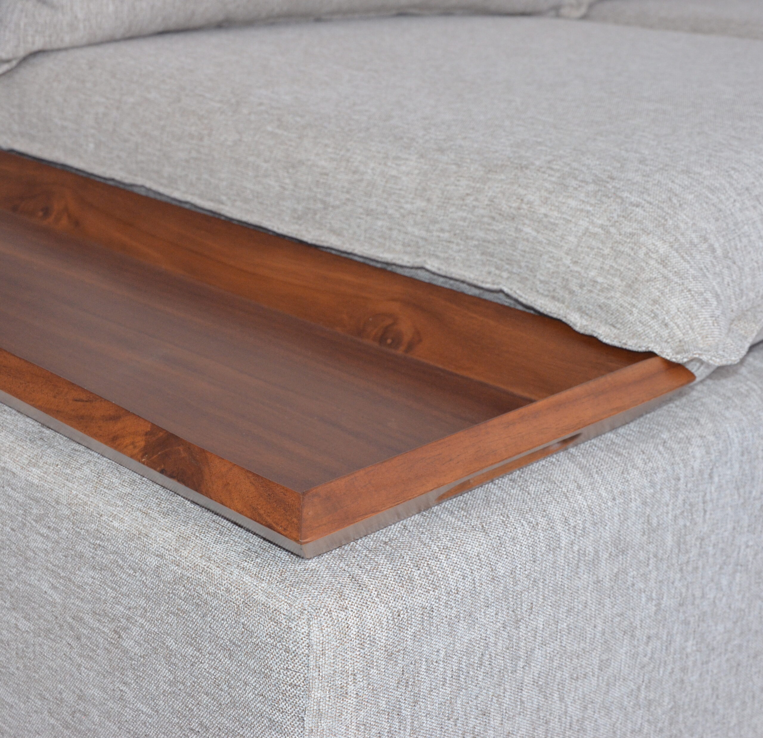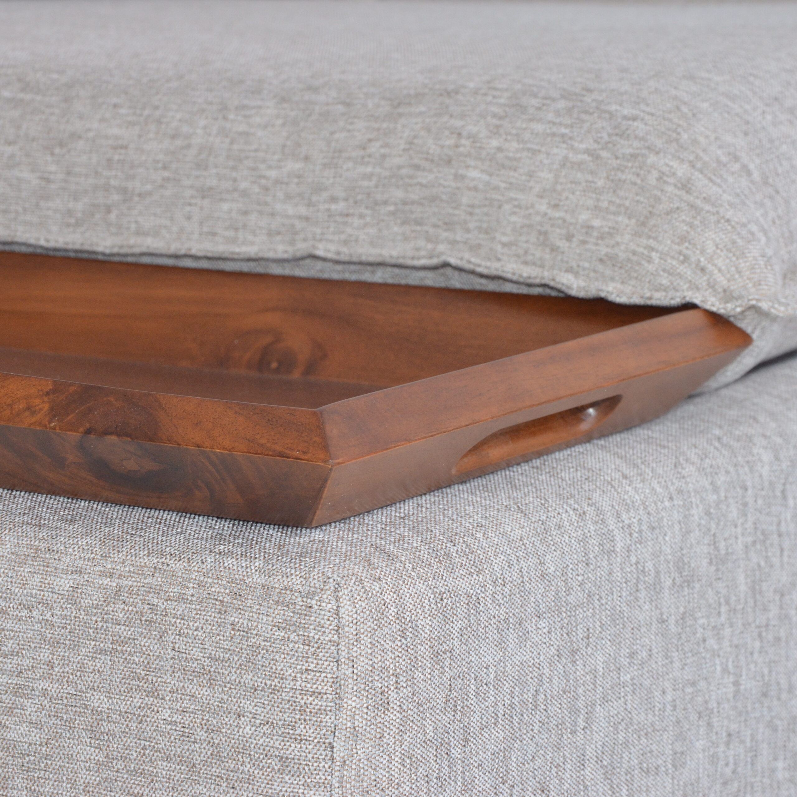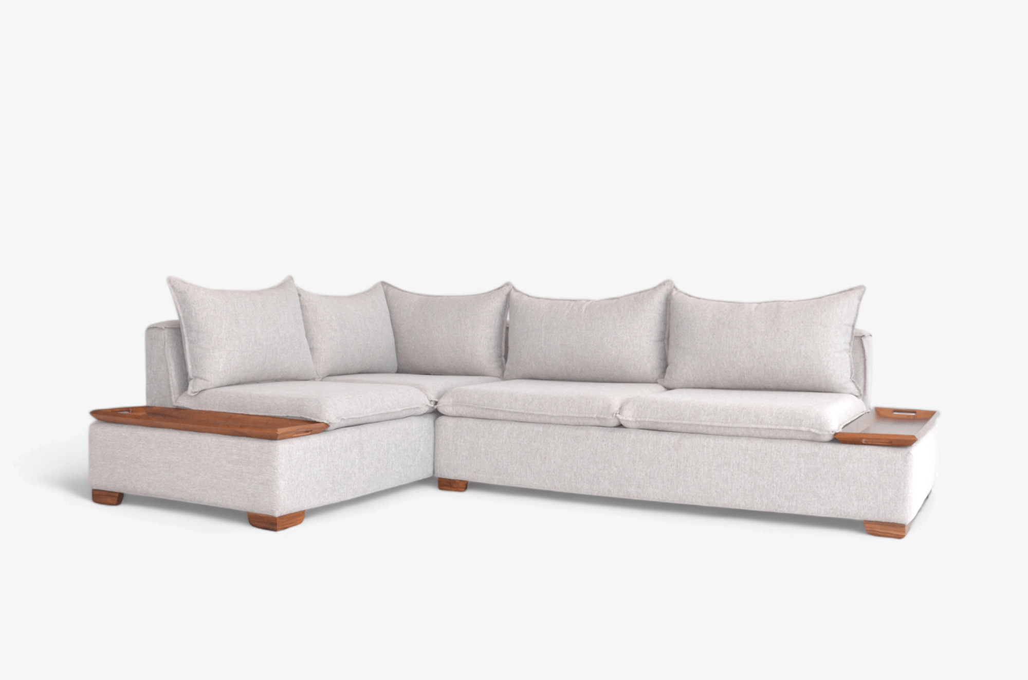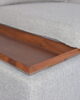 Sala esquinera Kenia de 2 piezas con diseño moderno, acabados en tela Columbia Truffle y charolas decorativas de madera de parota. Sofisticación, funcionalidad y estilo en una sola sala. Medidas: 3.00 x 2.00 m.
