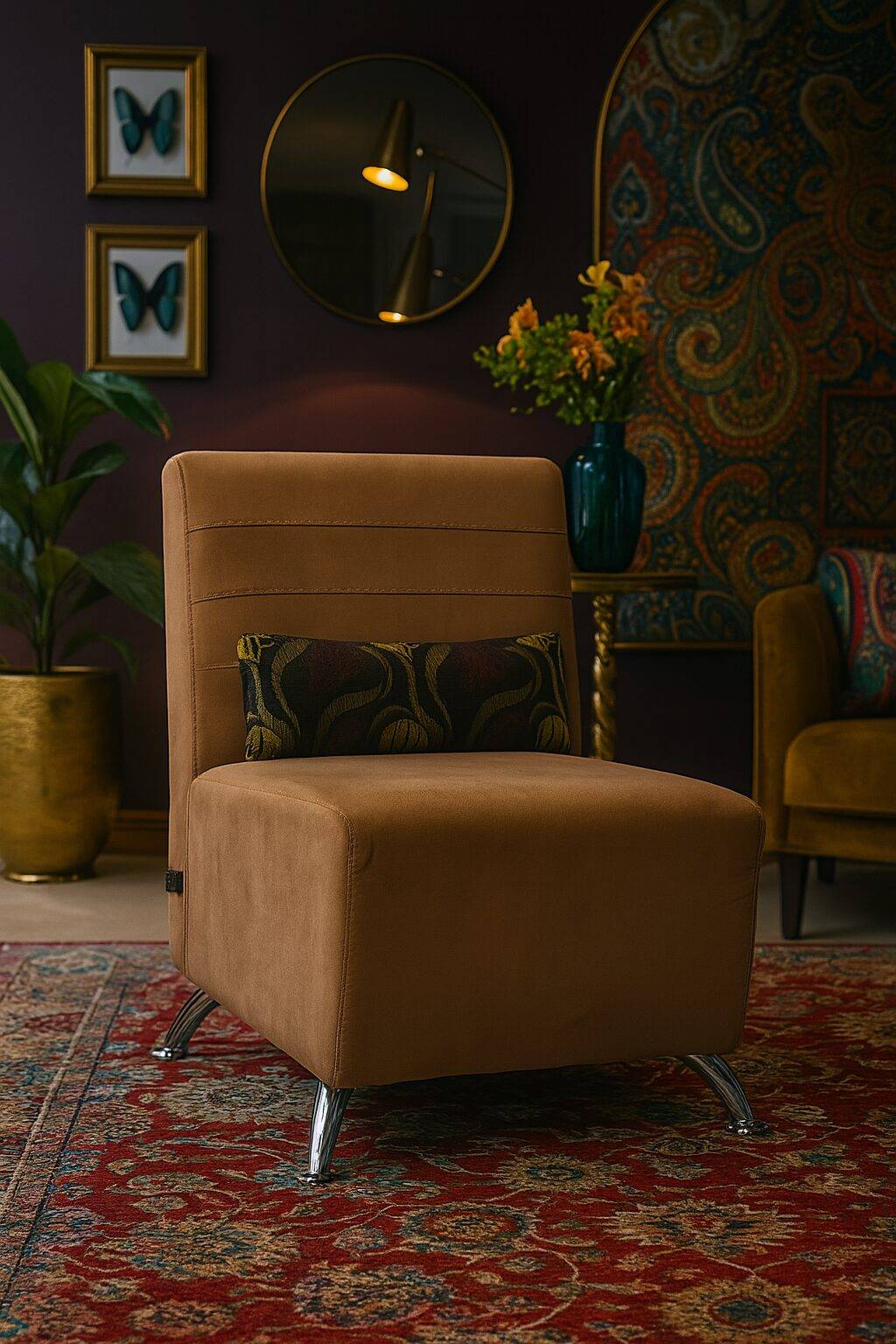 El sillón Karee es ideal para quienes buscan un toque sofisticado sin saturar el espacio. Tapizado en suave tela velvet camell, ofrece una textura lujosa al tacto y un acabado visual que eleva cualquier rincón del hogar.