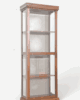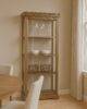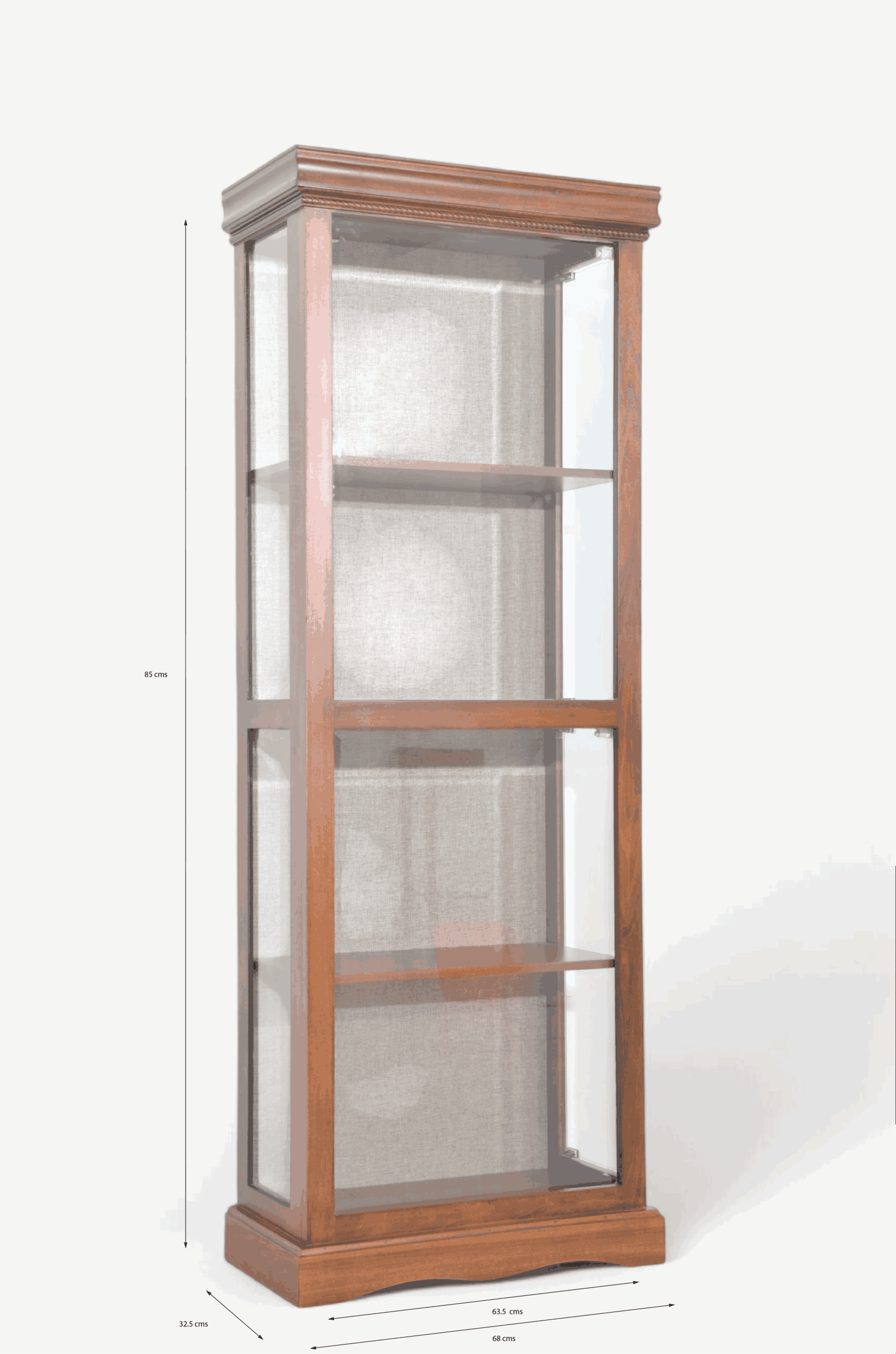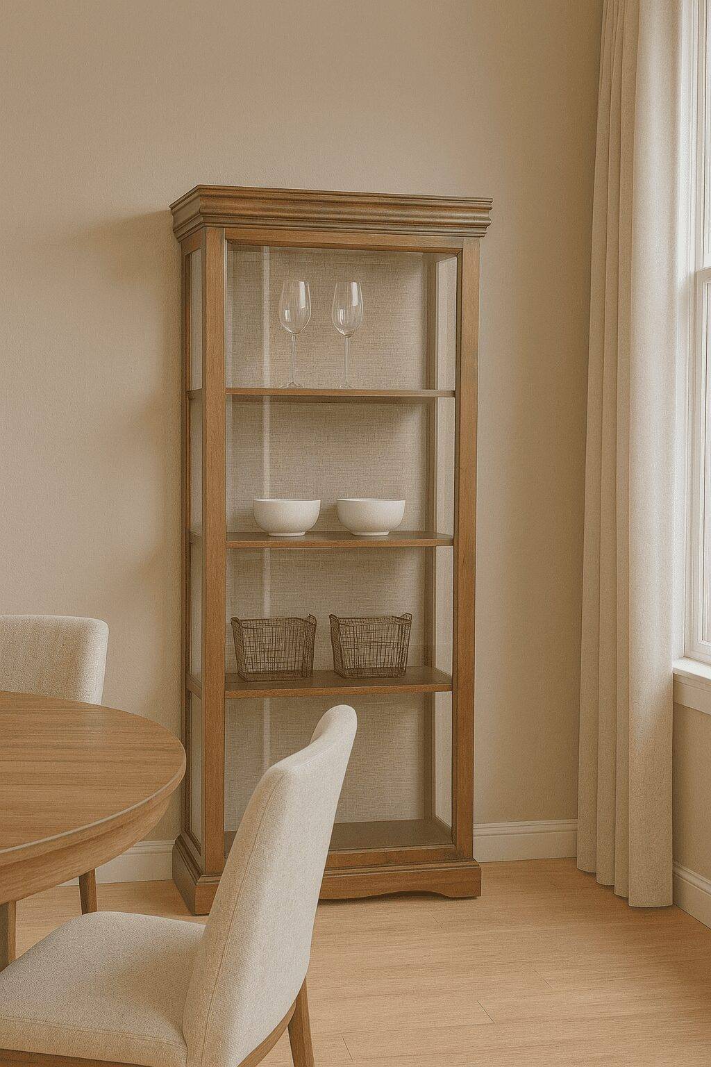Elegancia clásica y funcionalidad en una sola pieza. Esta vitrina de madera poplar americano con puerta de cristal y fondo en lino neutro es ideal para exhibir tus objetos favoritos con estilo y protección.